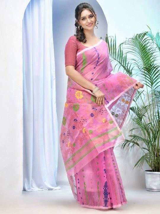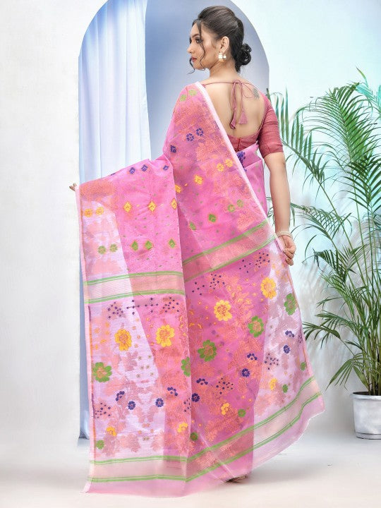 Pink & Blue Jamdani Saree with Ethnic Motifs and Woven Design