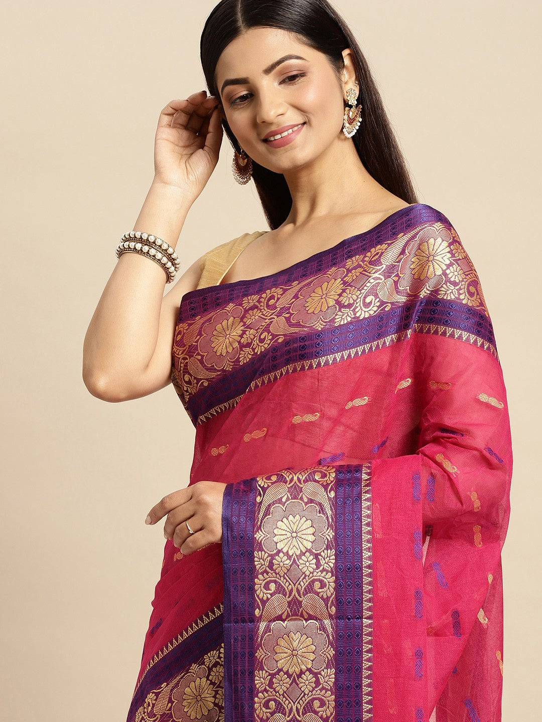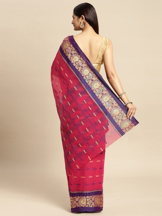 Pink taant saree Ethnic motifs woven design saree with woven design border border The saree does not come with a blouse piece The model is wearing a blouse for modelling purpose only