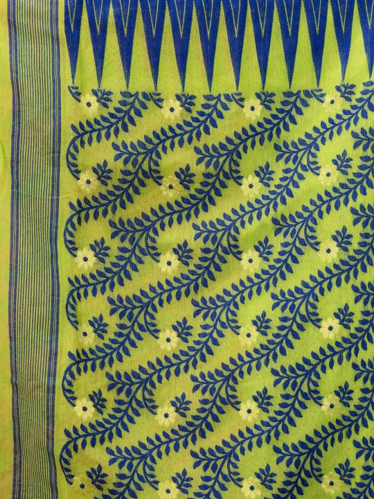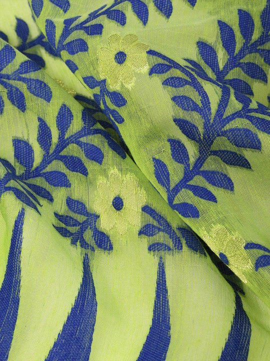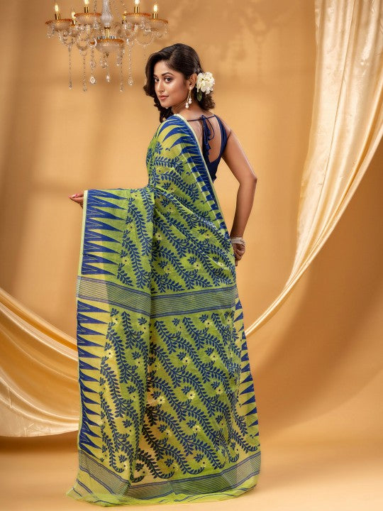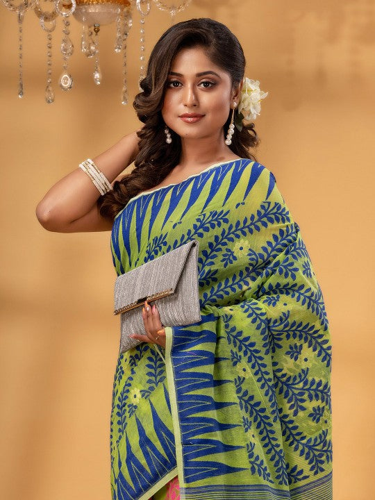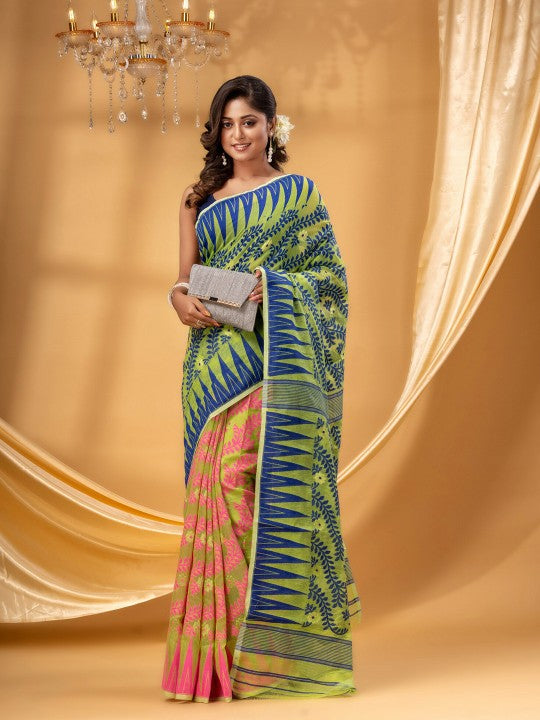 This DESH BIDESH pure cotton Jamdani saree presents a harmonious blend of traditional craftsmanship and contemporary aesthetics. The exquisite Jamdani weave, known for its intricate patterns, is meticulously integrated into the fabric. Featuring a captivating pink and green colour palette, this saree exudes a vibrant yet sophisticated charm. Its distinctive woven design border adds a refined touch, enhancing the overall appeal. Crafted from premium pure cotton, the saree ensures exceptional comfort and breathability for extended wear. This elegant drape is ideal for festive occasions, cultural gatherings, and formal events. The lightweight texture allows for graceful movement and effortless styling. It embodies a rich heritage of Indian textile artistry, making it a valuable addition to any discerning wardrobe. The durable fabric maintains its pristine condition, offering lasting beauty and elegance. Pair it with traditional jewellery for a complete and stunning ensemble.