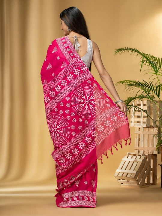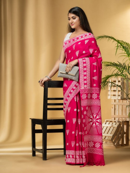 This exquisite DESH BIDESH saree, crafted from pure cotton, showcases an intricate paisley print with a complementary printed border, offering a blend of traditional artistry and contemporary elegance. The lightweight taant weave ensures exceptional comfort and breathability, making it suitable for various occasions. The saree comes with an unstitched blouse piece made from pure cotton, allowing for custom tailoring to achieve a perfect fit. Its vibrant pink and white color palette adds a touch of sophistication and charm to your ethnic wardrobe. The fabric's inherent softness provides a luxurious feel against the skin, ensuring all-day comfort. This piece exemplifies superior craftsmanship and attention to detail, characteristic of high-quality Indian textiles. It is an ideal choice for cultural events, festive celebrations, or formal gatherings where refined traditional attire is desired. The durable cotton material ensures longevity and retains its aesthetic appeal after multiple wears and proper care. This saree represents a harmonious fusion of cultural heritage and modern design sensibilities. Its versatile design allows for diverse styling, from classic drapes to more contemporary presentations.