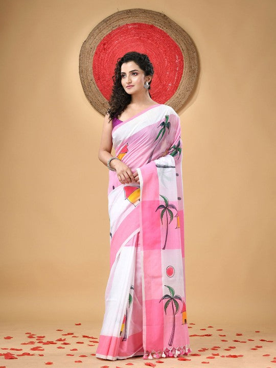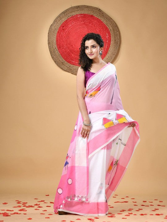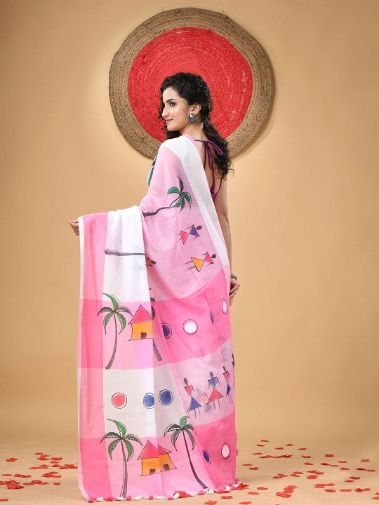 Pink & White Pure Cotton Taant Saree with Ethnic Motifs