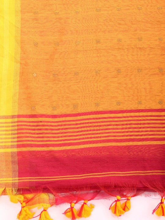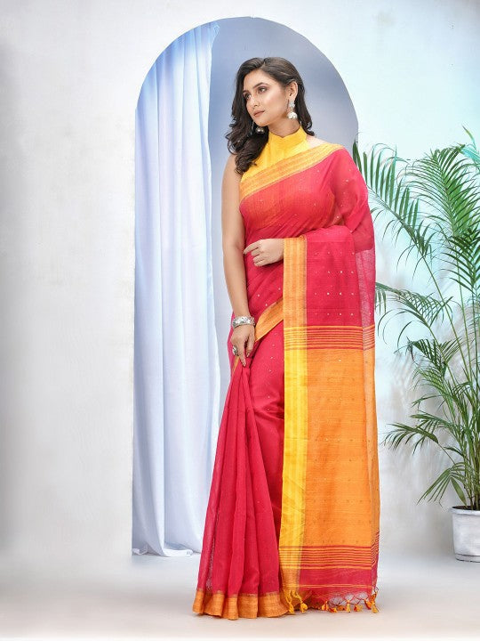 Presenting the DESH BIDESH Sequinned Saree, a stunning addition to your ethnic wardrobe. This elegant saree features a beautiful pink and yellow colour combination, exuding traditional charm. It showcases a solid design with a matching solid border, meticulously crafted for a refined look. The saree is adorned with exquisite sequinned details, adding a touch of sparkle and sophistication. Included is an unstitched blouse piece, allowing for personalised tailoring to achieve your perfect fit. Kindly note that the blouse displayed by the model is purely for styling inspiration. For the actual pattern and appearance of the blouse piece, please refer to its dedicated image. This piece is ideal for festive occasions, weddings, or grand celebrations. Its captivating appeal ensures you make a memorable statement.
