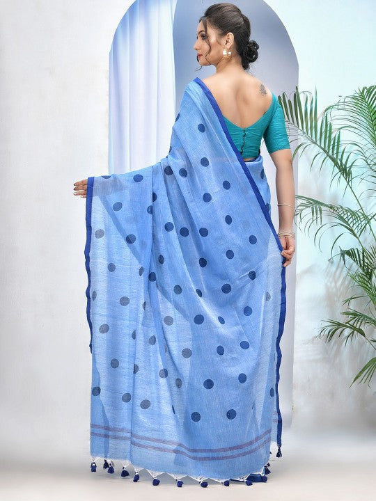 This exquisite blue pure cotton saree from DESH BIDESH features a charming polka dot print and a sophisticated solid border, embodying traditional Indian elegance. Crafted from breathable pure cotton, it offers exceptional comfort and a graceful drape, ideal for prolonged wear. The timeless design ensures versatility, making it suitable for both casual outings and festive celebrations. Its lightweight nature allows for effortless styling, enhancing your overall ethnic ensemble. Proper dry cleaning is recommended to maintain the fabric's quality and vibrant colours over time. Please note that this saree does not include a blouse piece; the one depicted is for illustrative styling purposes only. This elegant piece is a quintessential addition to any discerning woman's wardrobe, promising both style and comfort.