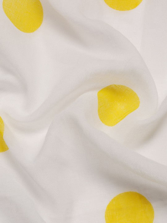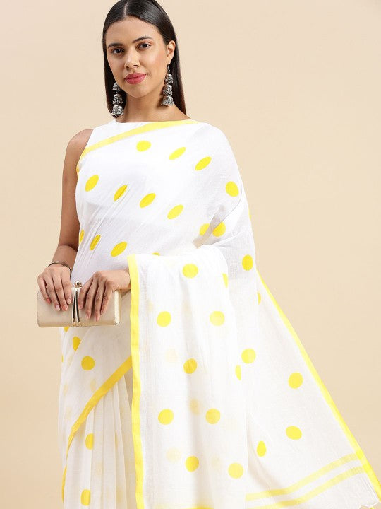 White and yellow taant saree. Polka dot printed saree with printed border border.
