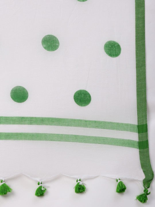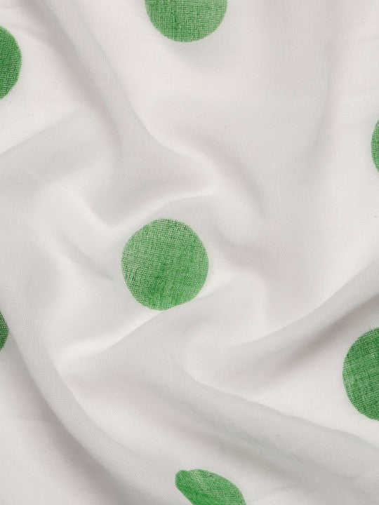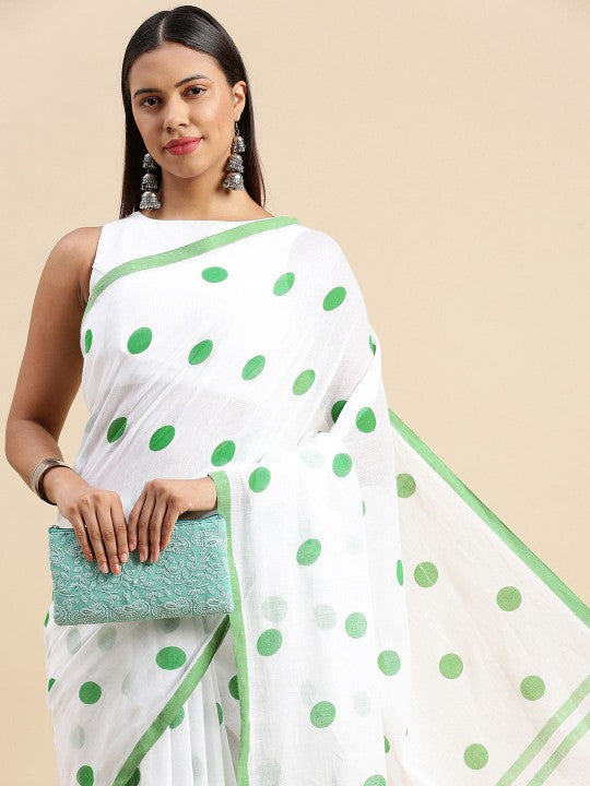 Green and white taant saree. Polka dot printed saree with printed border border.