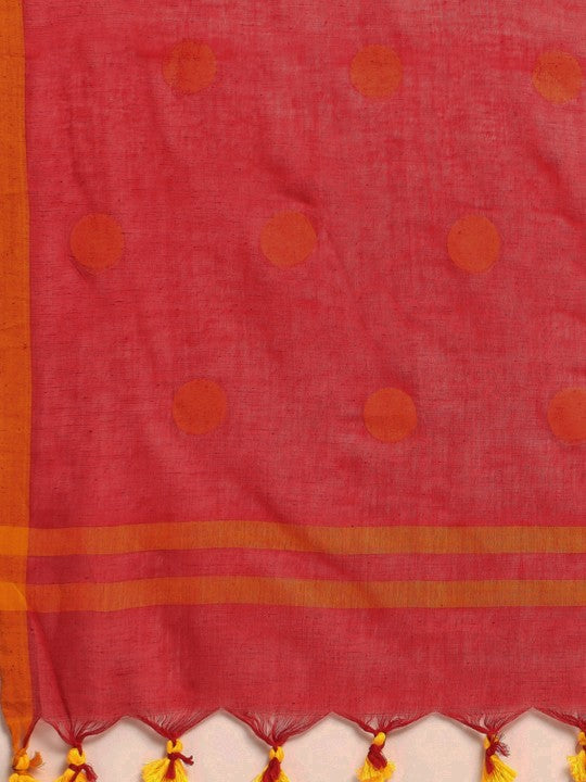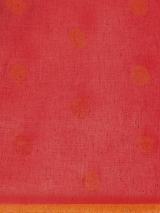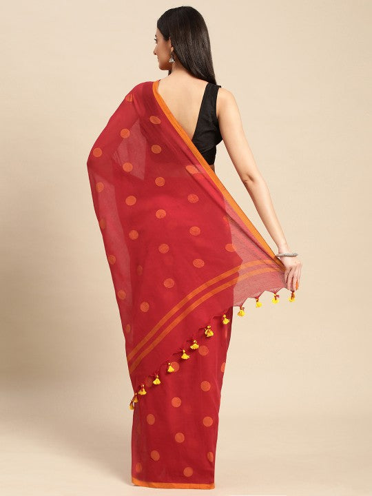 This elegant red Taant saree features a charming polka dot print, exuding a traditional yet stylish appeal. It is beautifully adorned with a woven design border, enhancing its sophisticated look. Crafted from 100% pure cotton, this saree offers exceptional comfort and breathability for extended wear. The generous length of 5.5 metres (18.04 feet) ensures graceful draping for various body types. Its approximate width of 1.06 metres (41.72 inches) provides ample fabric for elegant pleats. This saree does not include a separate blouse piece, allowing for customisation with your preferred design. For care, it requires dry cleaning to maintain its pristine condition and vibrant colours. Avoid tumble drying and use low heat when ironing. Professional dry cleaning is recommended, and bleaching should be strictly avoided. This saree is perfect for everyday wear or festive occasions, blending traditional craftsmanship with contemporary aesthetics.