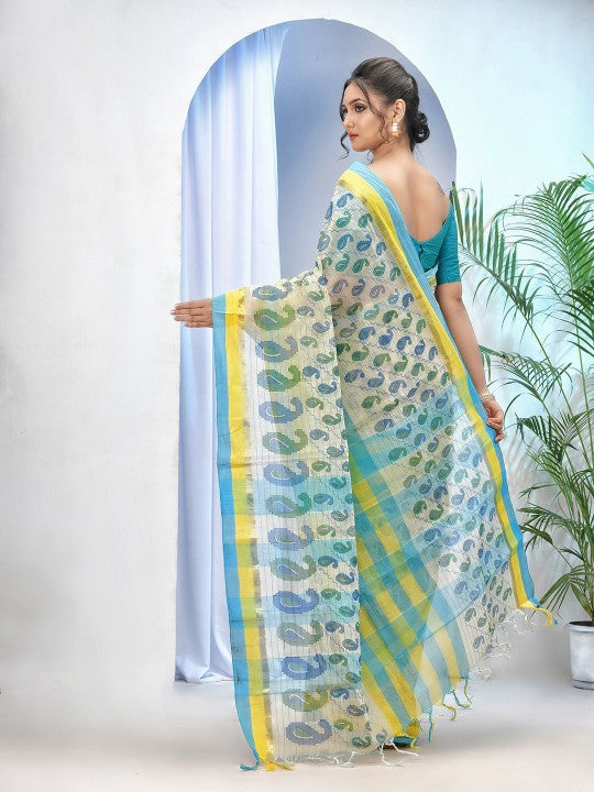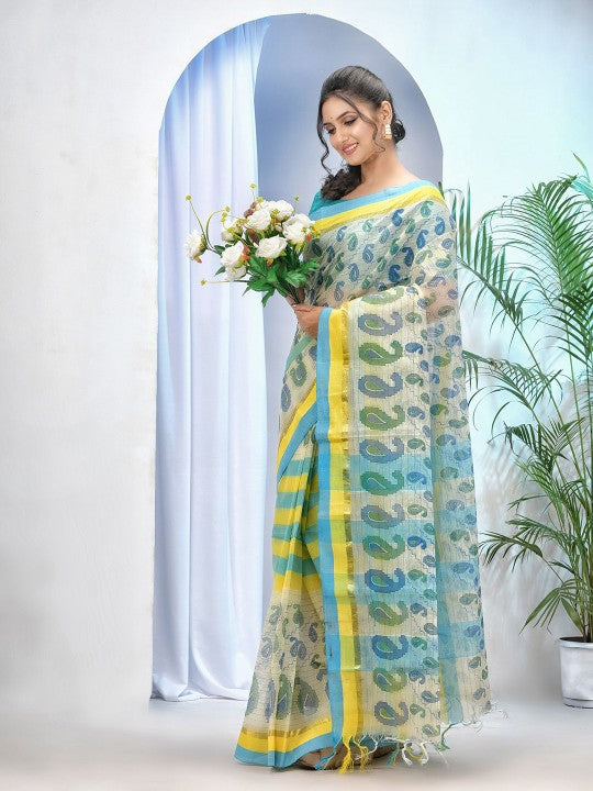 Discover the timeless elegance of the DESH BIDESH Printed Zari Paisley Pure Cotton Taant Saree, designed for the modern Indian woman. This exquisite saree features a vibrant blue and yellow colour palette, adorned with intricate paisley prints that exude traditional charm. Crafted from pure cotton, it ensures exceptional comfort and breathability, making it ideal for various occasions. The delicate zari work along the borders adds a touch of subtle shimmer and sophistication. Its lightweight Taant weave allows for graceful draping and easy movement throughout the day. This saree promises to enhance your ethnic wardrobe with its rich heritage and contemporary appeal. Please note, this saree does not include a blouse piece. Elevate your style effortlessly with this beautiful and culturally rich ensemble. It is perfect for festive celebrations, family gatherings, or casual outings where comfort meets classic fashion.