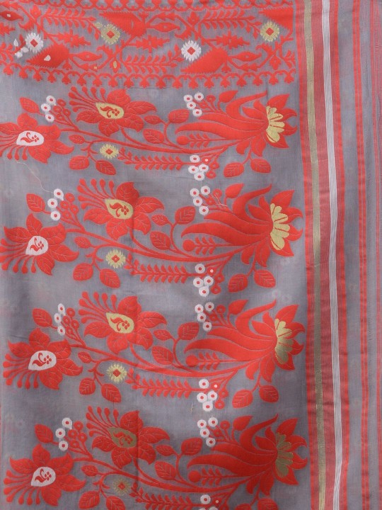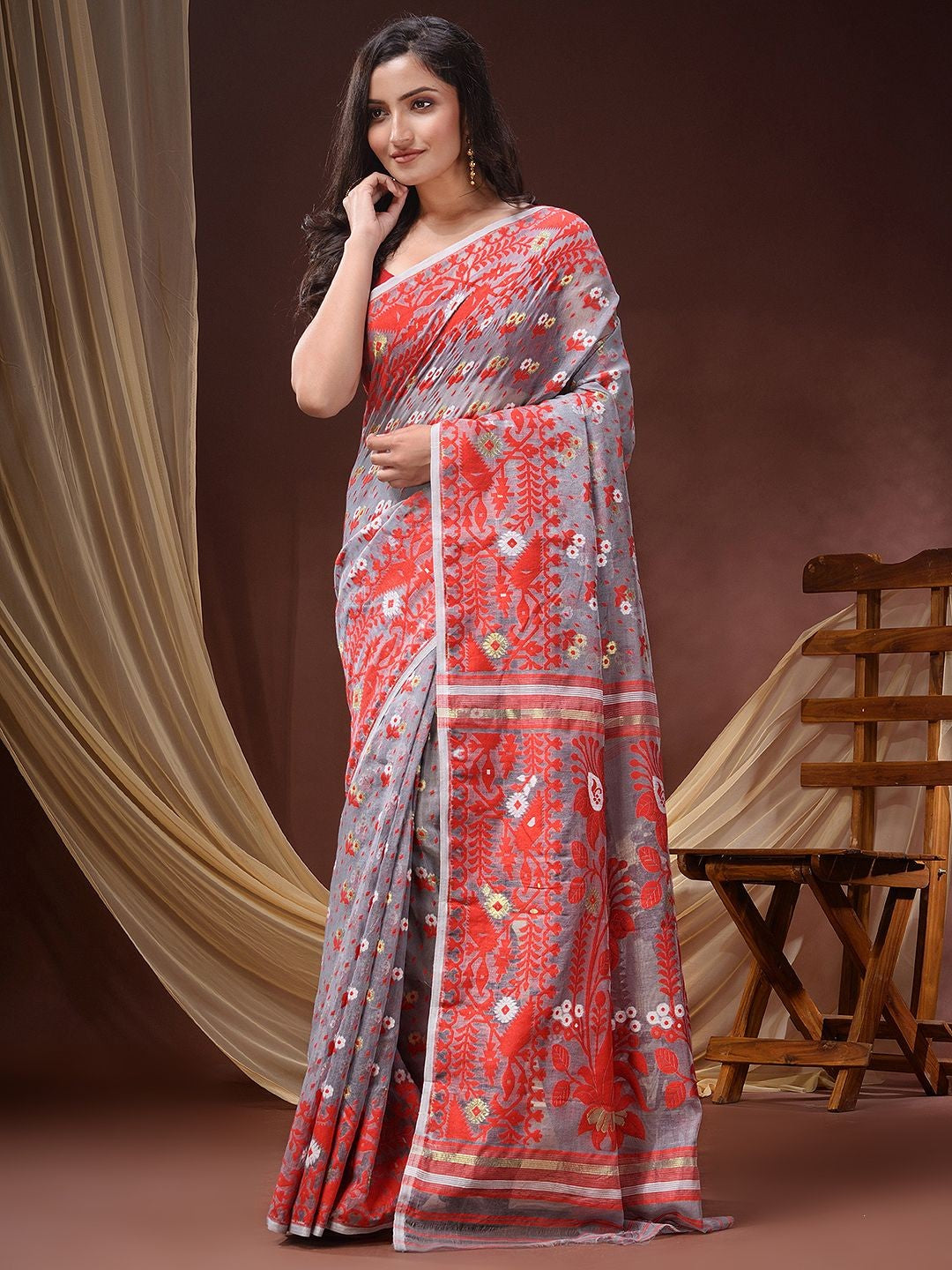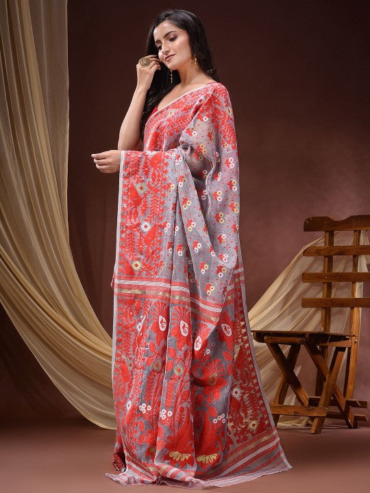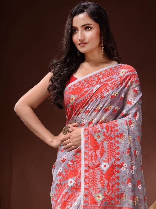 Experience the exquisite craftsmanship of the DESH BIDESH Ethnic Motifs Jamdani Saree, a timeless addition to any discerning wardrobe. Meticulously handcrafted from pure cotton, this saree offers unparalleled comfort and breathability, ideal for diverse climates. Its intricate ethnic motifs are masterfully woven into the fabric, showcasing a rich tapestry of traditional artistry. The elegant woven design border adds a sophisticated contrast, enhancing the saree's overall aesthetic appeal. This grey and red colour palette provides a striking visual harmony, ensuring you stand out with understated grace. The Jamdani weaving technique, renowned for its delicate patterns, exemplifies a heritage of textile excellence. This handloom creation drapes beautifully, accentuating the wearer's silhouette with effortless elegance. Perfect for festive occasions or cultural gatherings, it merges traditional charm with contemporary sensibilities. The pure cotton composition ensures durability and easy maintenance, promising lasting beauty. Please note, the accompanying blouse piece is included, though the styled blouse in the image is for display purposes only.