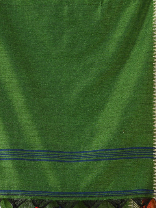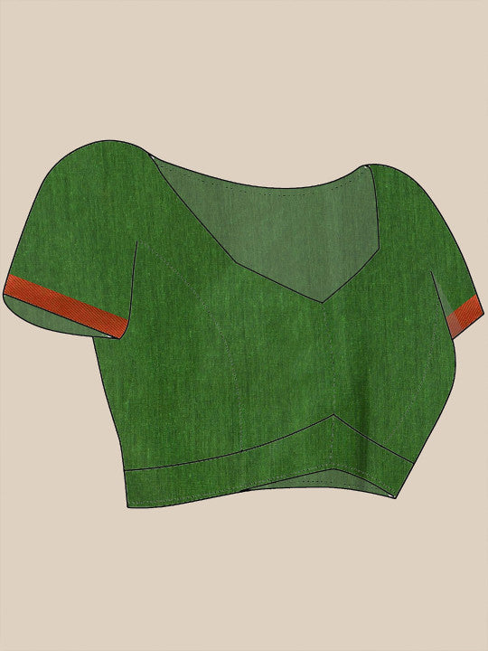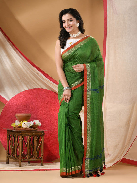 This exquisite DESH BIDESH saree features a captivating green and red colour combination. It is a solid saree, elegantly enhanced with a beautifully woven design border, showcasing traditional craftsmanship. The set includes an unstitched blouse piece; please refer to the blouse piece image for its actual appearance, as the model's blouse is for styling purposes only. Crafted from pure cotton for both the saree and the blouse fabric, it ensures comfort and a graceful drape. The saree measures approximately 18.04 feet in length, accompanied by a 2.62-foot blouse piece. Its width is approximately 3.48 feet, offering ample material for a perfect fit. For maintenance, dry cleaning is recommended to preserve its intricate details and fabric quality. This pure cotton handloom saree is a timeless addition to your ethnic wear collection. It promises both elegance and comfort for any special occasion. Experience the rich heritage of Indian textiles with this stunning piece.