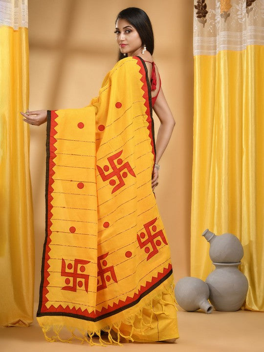 Experience the vibrant elegance of the DESH BIDESH Pure Cotton Handloom Taant Saree. This exquisite saree showcases a striking yellow and red colour combination, perfect for festive occasions and cultural gatherings. It features a sophisticated geometric printed design, meticulously crafted with a woven border that adds a touch of traditional charm. Made from pure cotton, both the saree and its accompanying unstitched blouse piece ensure exceptional comfort and breathability throughout the day. The lightweight fabric drapes beautifully, offering a graceful silhouette. This saree is ideal for women who appreciate authentic handloom artistry and traditional Indian fashion. To maintain its pristine condition, dry cleaning is recommended. Please note that the blouse shown on the model is for styling purposes; refer to the provided blouse piece image for actual design. Embrace timeless style and cultural heritage with this stunning taant saree.