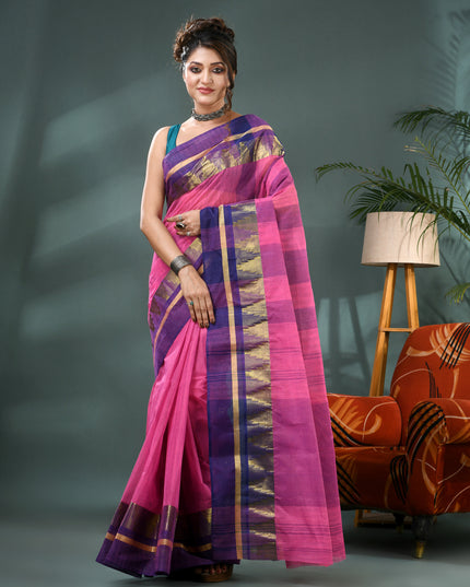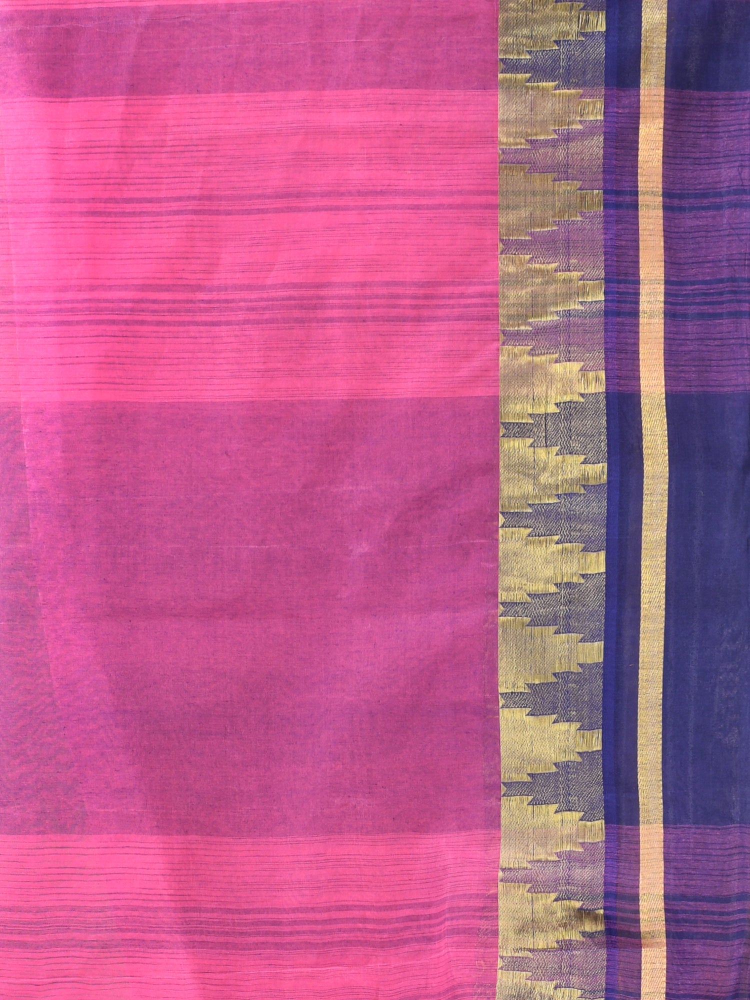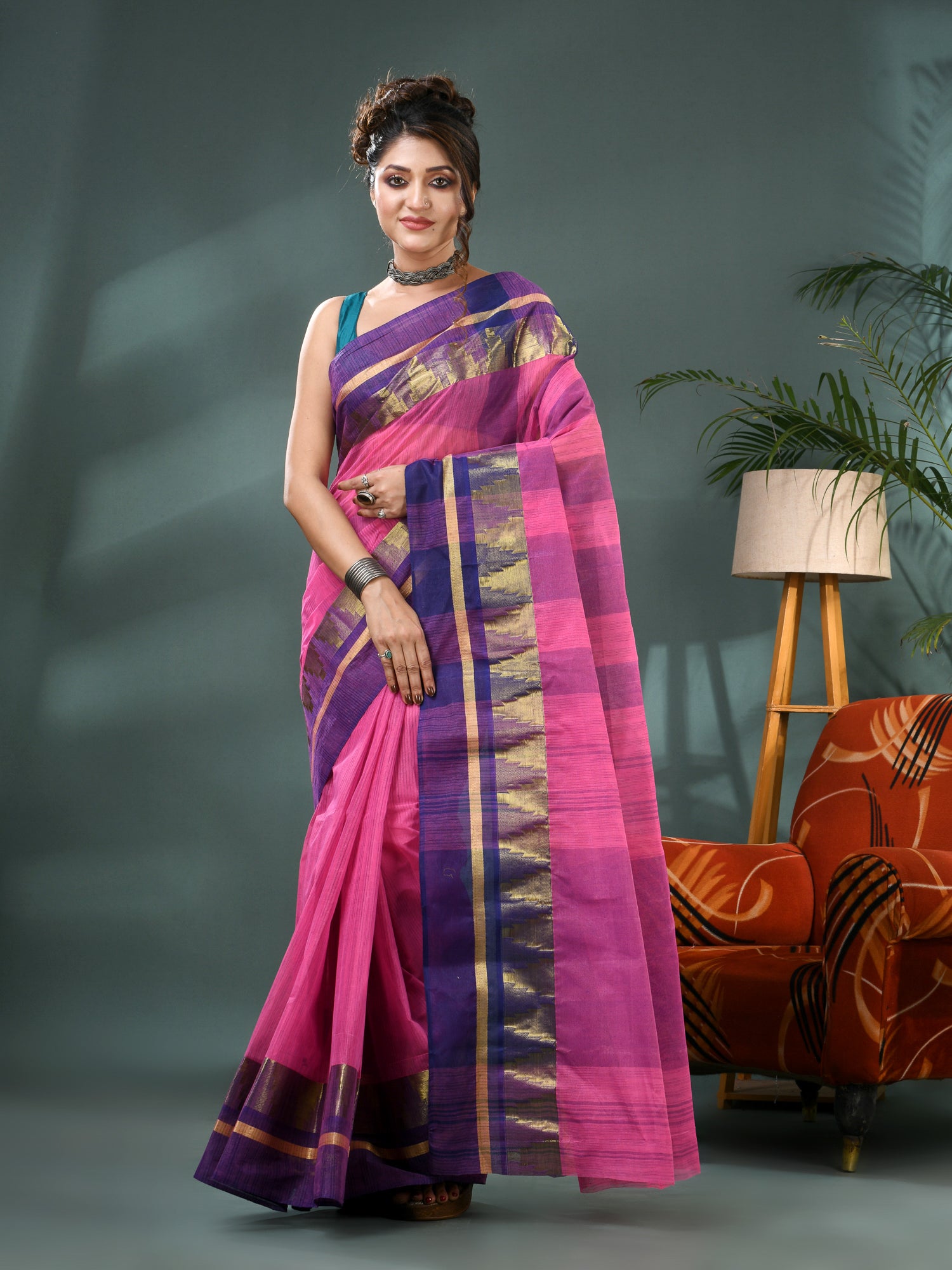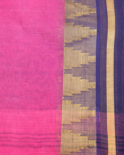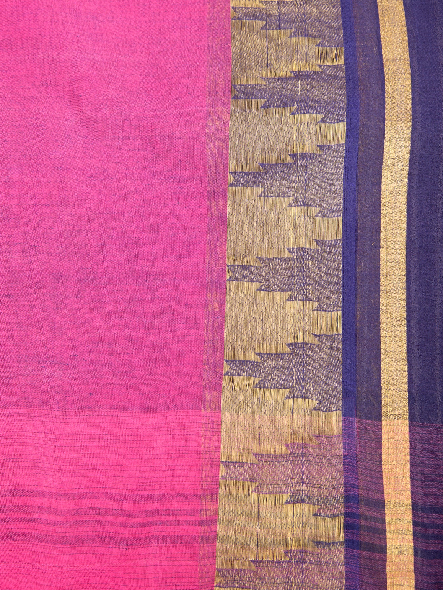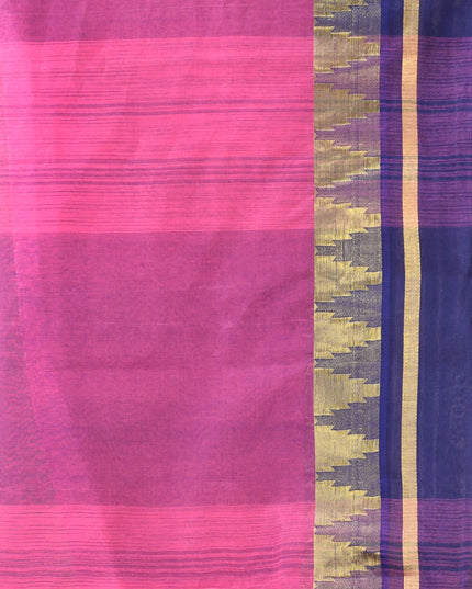 Pure Cotton Handloom Zari Temple Design Tant Saree - Blue Pink