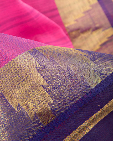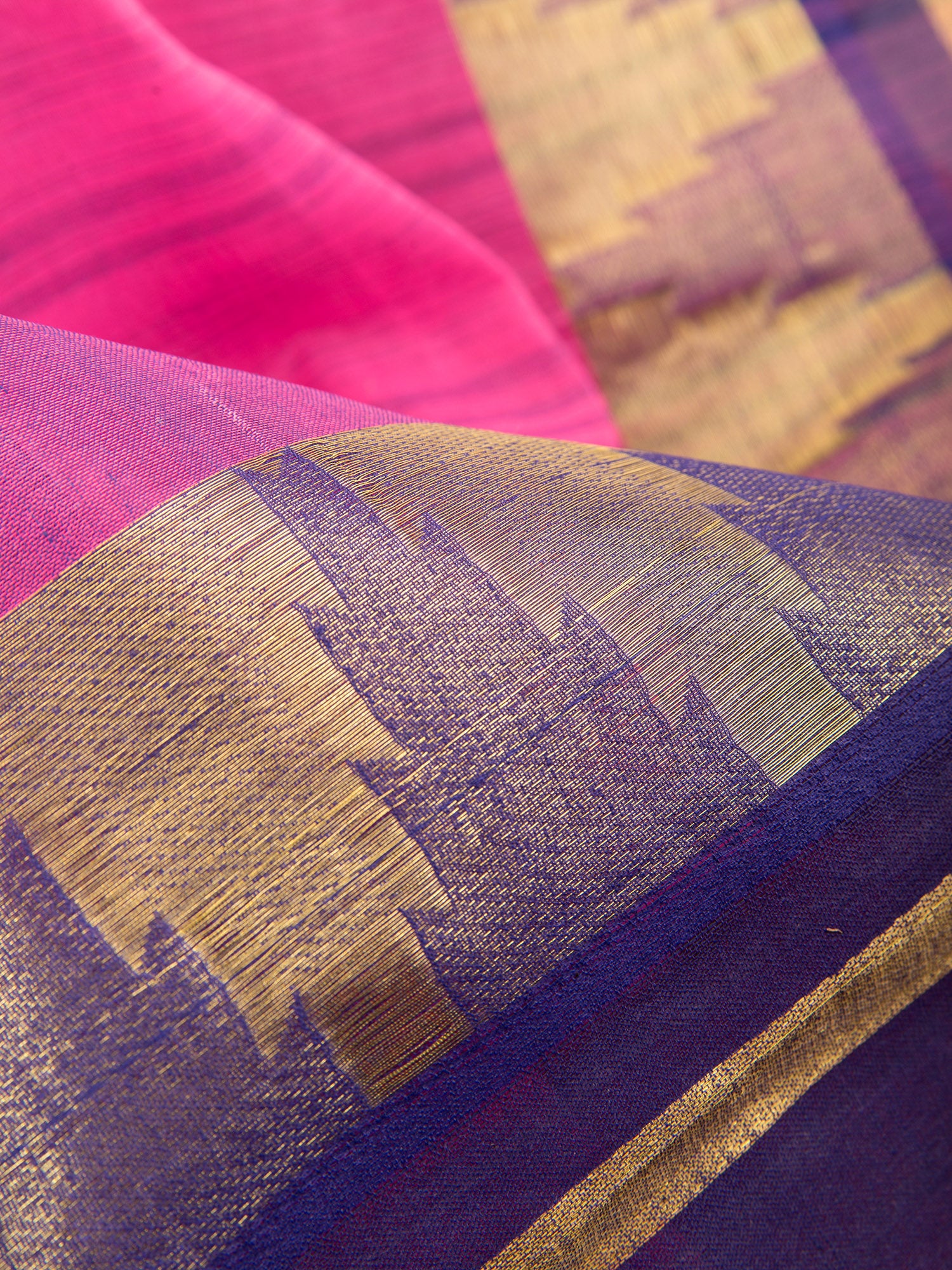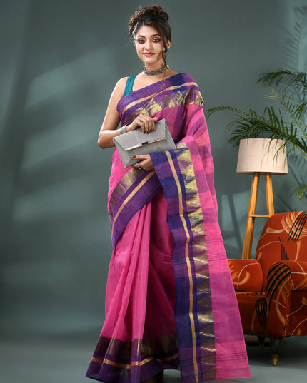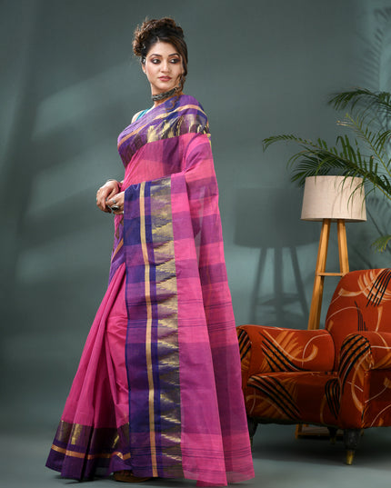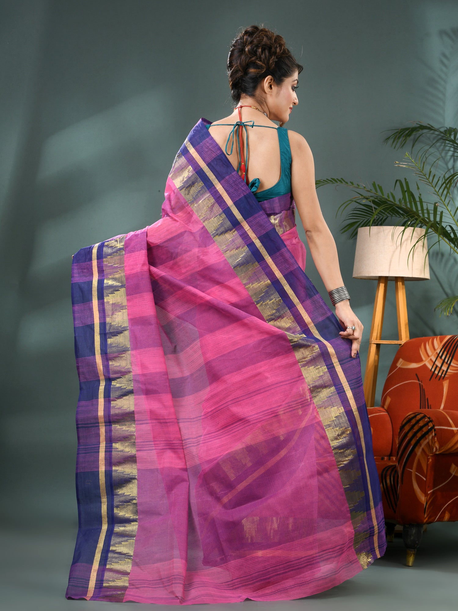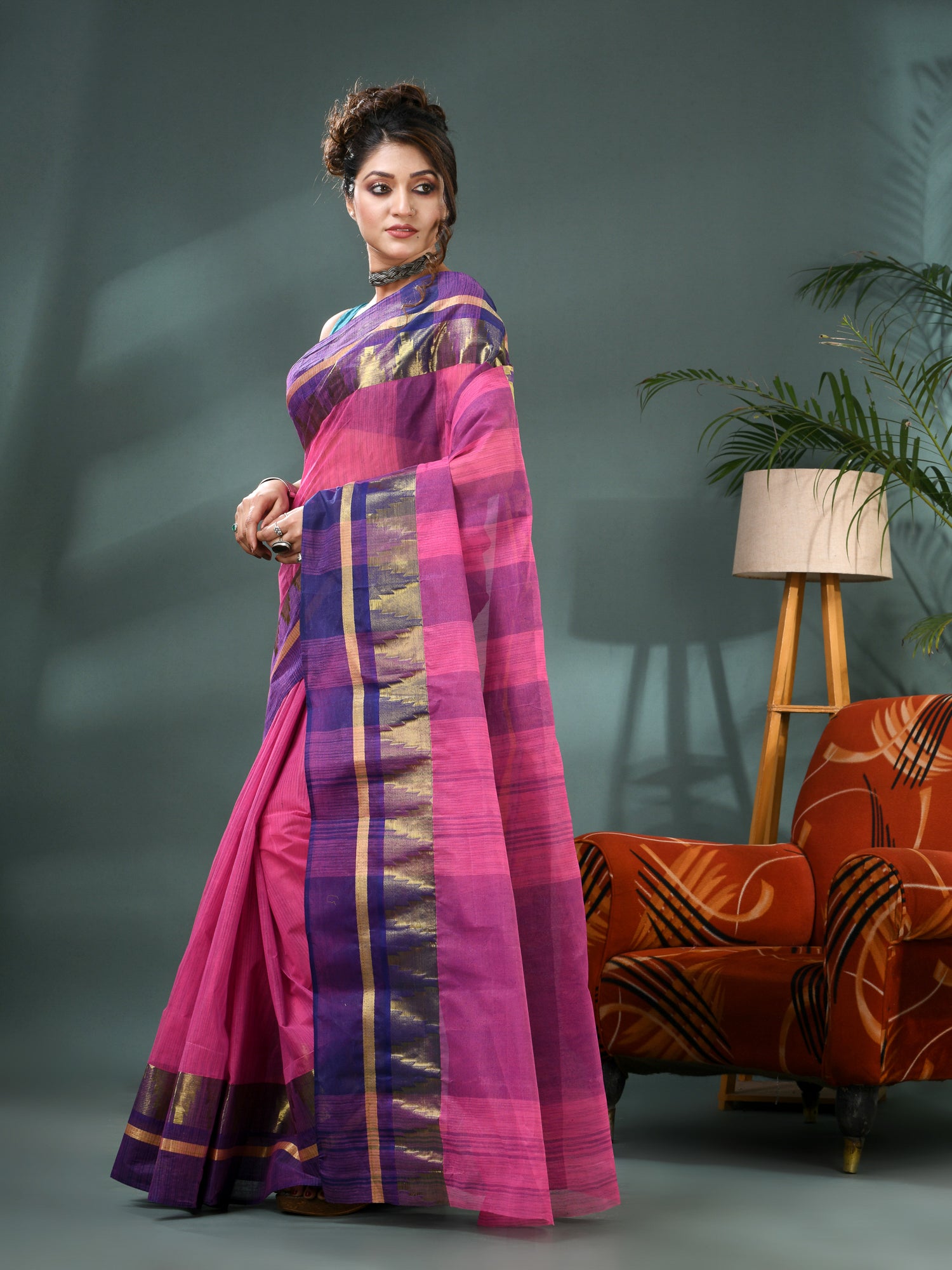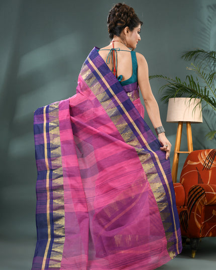 Pure Cotton Handloom Zari Temple Design Tant Saree - Blue Pink