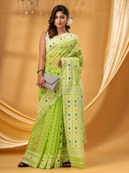 Experience the timeless allure of the DESH BIDESH Pure Cotton Jamdani Saree. This exquisite piece features a sophisticated green and white palette, offering a fresh and elegant aesthetic. Adorned with intricate ethnic motifs, the saree showcases the rich heritage of Jamdani weaving. A meticulously crafted woven design border further enhances its traditional appeal. Made from 100% pure cotton, it ensures exceptional comfort and breathability, making it ideal for extended wear. The fabric's natural properties provide a soft drape, flattering various body types. This Jamdani saree is perfectly suited for cultural events, festive celebrations, or formal gatherings. Its lightweight nature allows for effortless styling and comfortable movement throughout the day. Designed for longevity, this saree maintains its vibrant colours and structural integrity with appropriate dry cleaning. It represents an investment in classic Indian textile artistry.