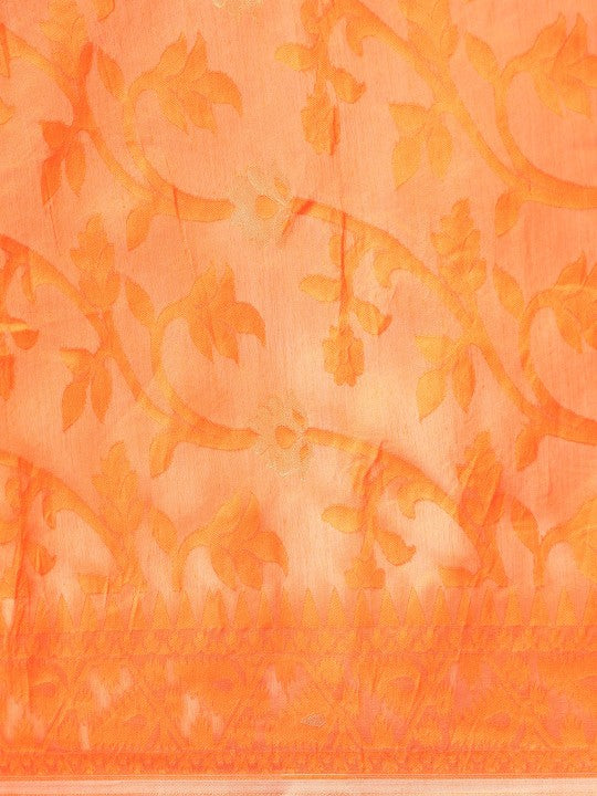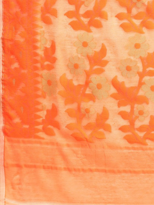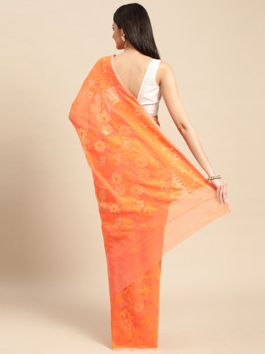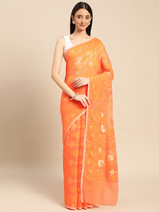 This DESH BIDESH Jamdani Saree features an exquisite orange hue, perfect for traditional occasions. It showcases intricate ethnic motifs with a beautifully woven design border, adding a touch of elegance. Crafted from 100% pure cotton, this saree ensures exceptional comfort and breathability throughout the day. The lightweight fabric drapes gracefully, enhancing your silhouette with its fluid fall. This ethnic garment is ideal for festive celebrations, cultural events, or daily wear. Its unique woven design highlights traditional Indian craftsmanship and artistic heritage. The saree measures approximately 18.04 feet in length and 3.48 feet in width, providing ample fabric for various draping styles. Please note that a blouse piece is not included with this saree. For care, dry cleaning is recommended to maintain the fabric's integrity and vibrant color. Avoid tumble drying and use low heat for ironing, with professional dry cleaning advised.