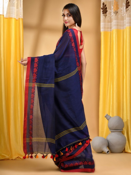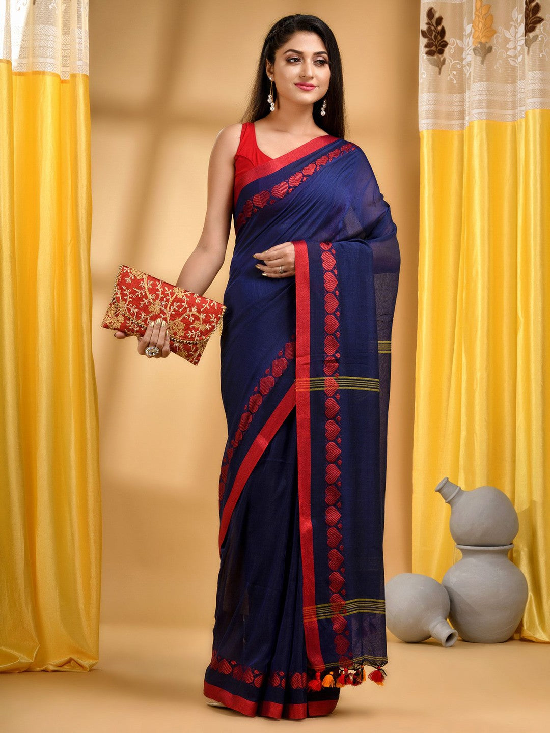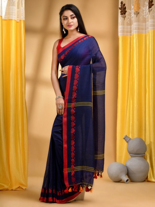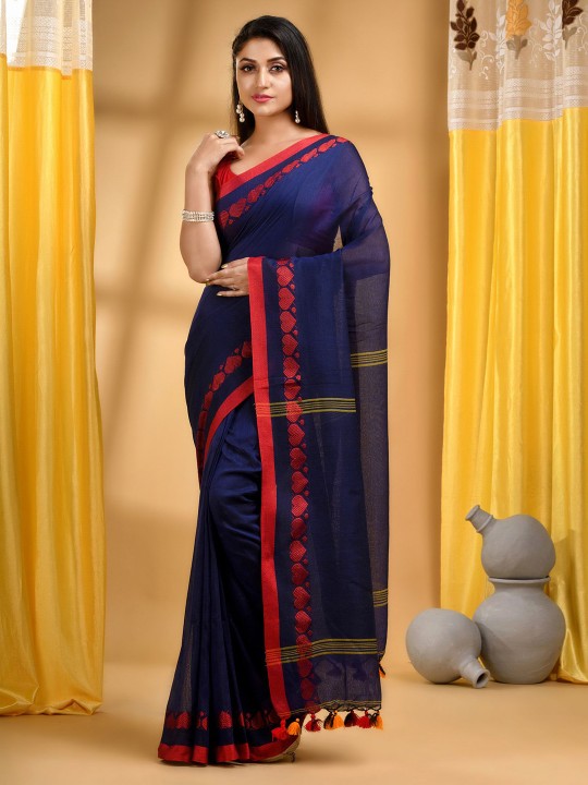 This Desh Bidesh Pure Cotton Woven Design Handloom Taant Saree is a beautiful blue taant saree. It features an intricate woven design with a striking solid border. The saree includes an unstitched blouse piece for custom tailoring. Please note that the blouse worn by the model is for styling purposes only. Refer to the image of the blouse piece to see its actual appearance. This authentic saree is available from DESH BIDESH. Style ID: 33207458.