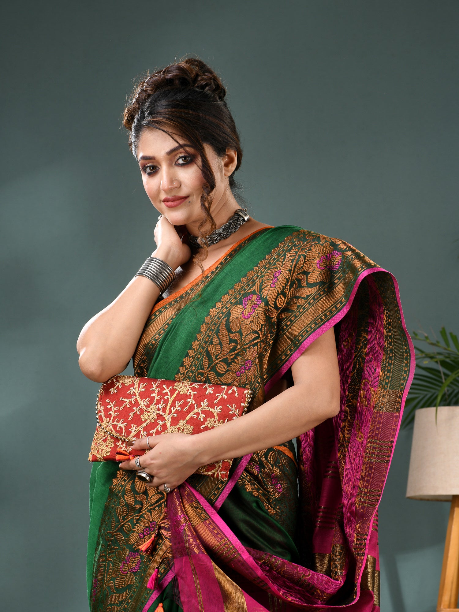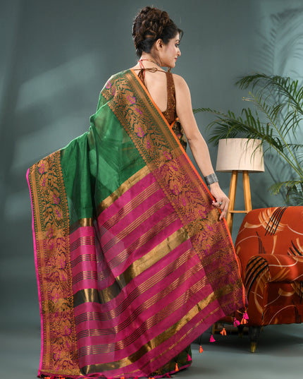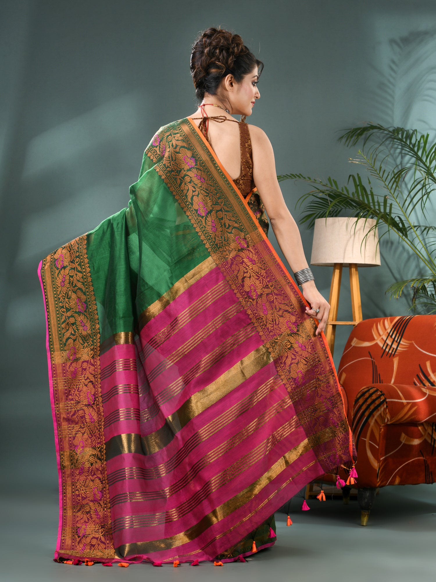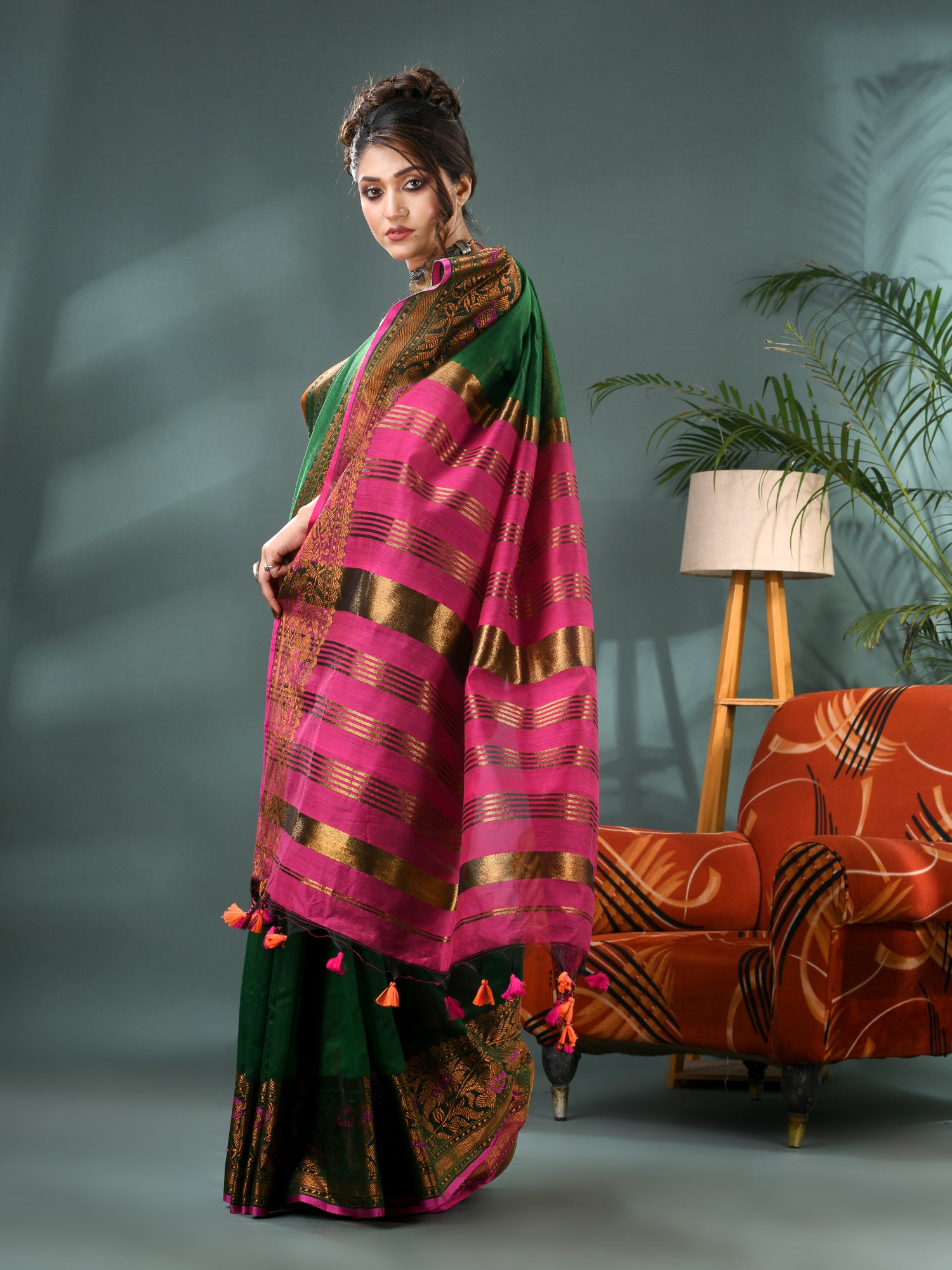 Pure Silk Kanjivaram Handloom Cotton Mine Rajoshree Designer Saree With Blouse Piece - Green Pink