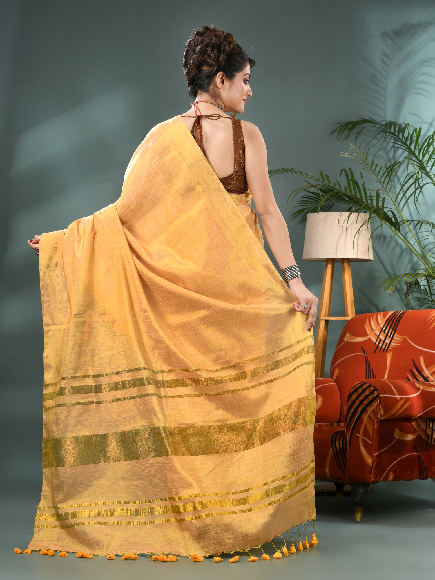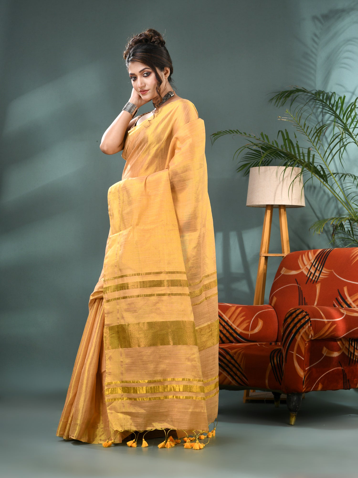 Step into elegance with the Raat Ki Roshni Golden Tissue Silk Saree – a luxurious drape crafted from rich tissue silk fabric that shimmers like starlight. This golden saree is a showstopper for wedding functions, party wear, and festive celebrations. The woven texture and soft silk finish make it easy to drape, while the included blouse piece completes your traditional yet trendy look. Whether you’re attending a wedding party, hosting a celebration, or need a silk saree for women that radiates class and grace – this gold tissue silk saree is your perfect match. Light, breathable, and dazzling – this saree reflects the magic of Indian craftsmanship.