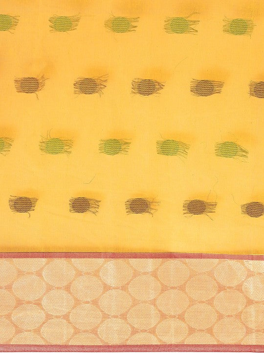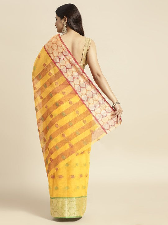 This red and yellow taant saree features a polka dot woven design and a distinct woven border. Please note that the saree does not come with a blouse piece. The model is wearing a separate blouse for styling purposes only.