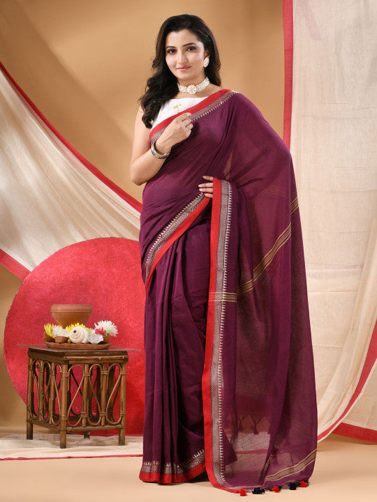 Purple saree. Solid saree with Embroidered border. Has embroidered details. The saree comes with an unstitched blouse piece. The blouse worn by the model might be for modelling purpose only. Check the image of the blouse piece to understand how the actual blouse piece looks like.