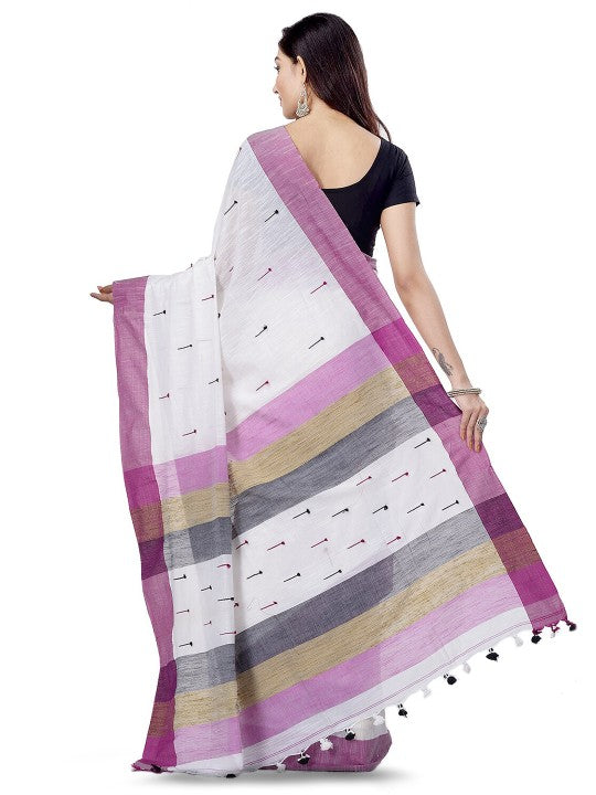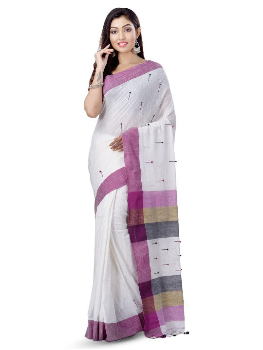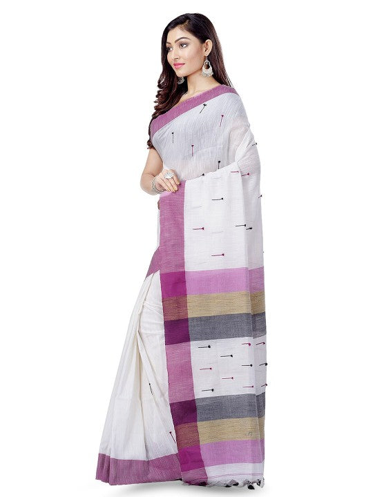 White and purple taant saree. Woven design saree with solid border. The saree comes with an unstitched blouse piece. The blouse worn by the model might be for modelling purpose only. Check the image of the blouse piece to understand how the actual blouse piece looks like.