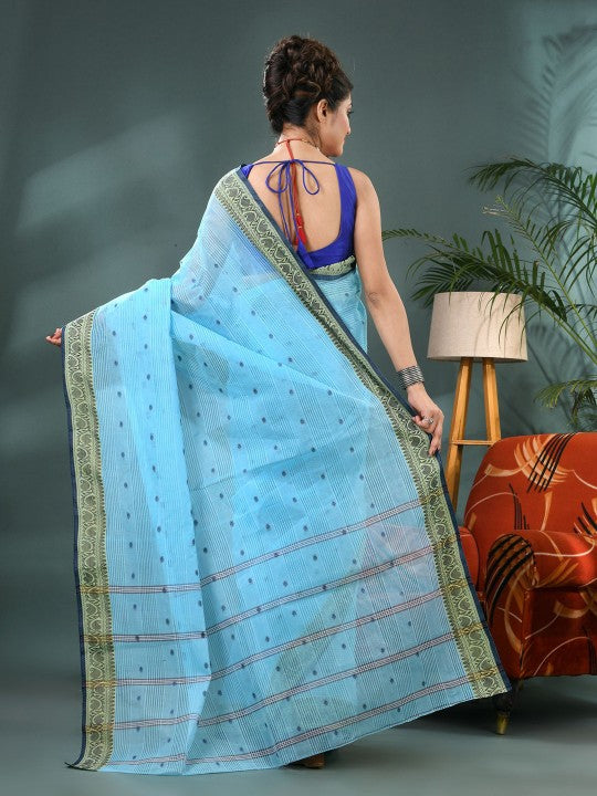 Description Adorn yourself in the exquisite DESH BIDESH Striped Pure Cotton Taant Saree, designed for the modern Indian woman. This elegant saree boasts a captivating blue and gold-toned palette, perfect for various festive and traditional gatherings. Crafted from premium pure cotton, it ensures exceptional comfort and breathability throughout the day. The intricate woven design, complemented by a beautiful woven border, adds a touch of timeless sophistication. It comes complete with an unstitched art silk blouse piece, allowing for custom tailoring to your preference. This versatile ensemble blends traditional aesthetics with contemporary appeal. The lightweight fabric drapes gracefully, enhancing your silhouette. Easy to maintain with dry clean care, this saree is a valuable addition to your ethnic wardrobe. Embrace the rich cultural heritage with this stunning piece from DESH BIDESH. It offers both elegance and ease, making it ideal for grand celebrations or intimate affairs.