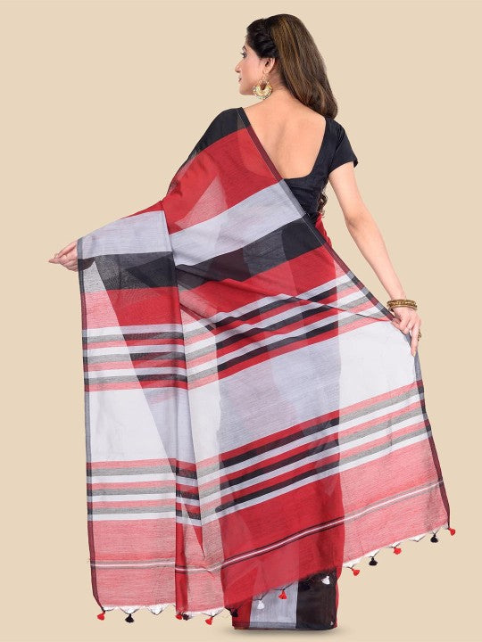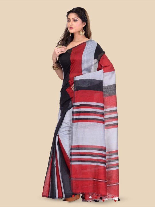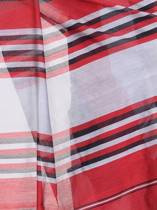 Discover the exquisite DESH BIDESH Striped Silk Cotton Saree, a perfect blend of tradition and contemporary style. This elegant saree features a striking red, black, and white striped pattern with a sophisticated solid border, making it ideal for festive occasions or daily wear. Crafted from soft silk cotton, it ensures exceptional comfort and a graceful drape, enhancing your silhouette. The saree comes with an unstitched blouse piece, allowing for custom tailoring to your preference. Please note, the blouse worn by the model is for styling purposes only; refer to the provided image for the actual blouse piece. This beautiful saree is easy to maintain with dry clean only care instructions. Elevate your ethnic wardrobe with this timeless piece, designed for the discerning Indian woman. Its vibrant colours and classic stripes make it a versatile addition for any event.