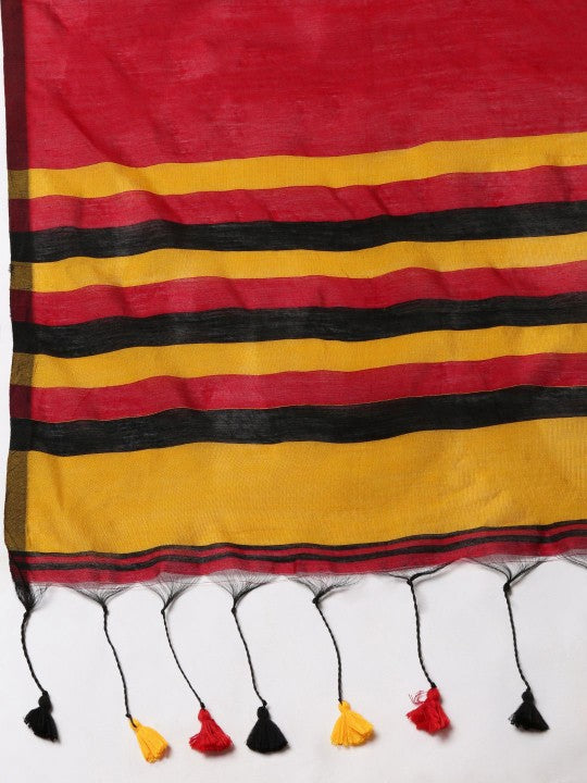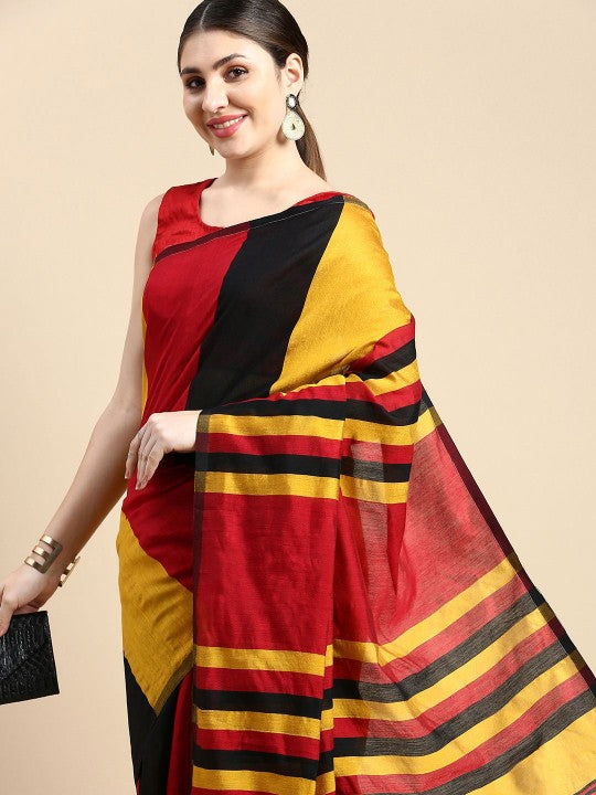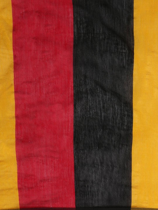 Bengal Ghicha Handloom Cotton Silk Saree With Blouse Piece (Black Yellow Red)