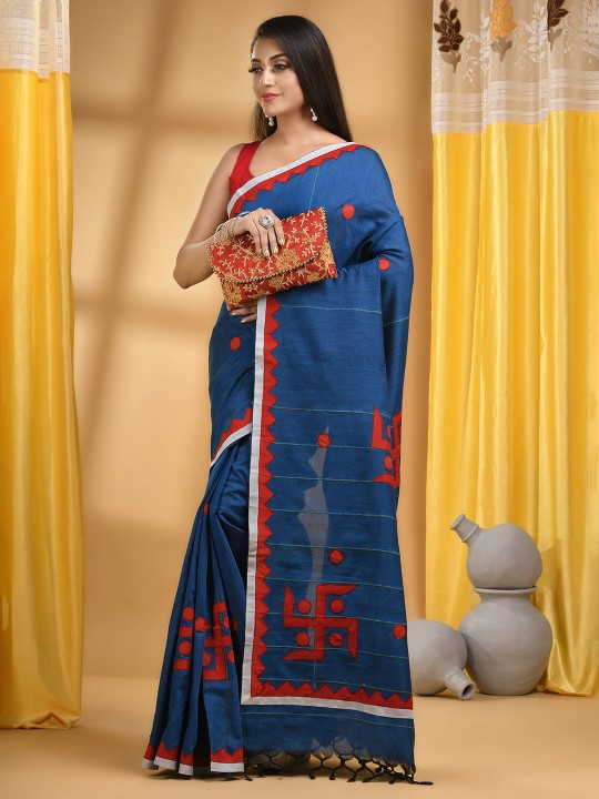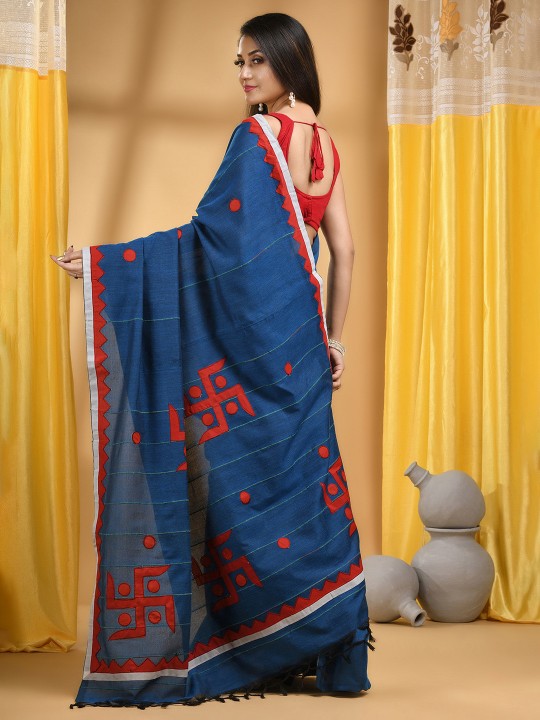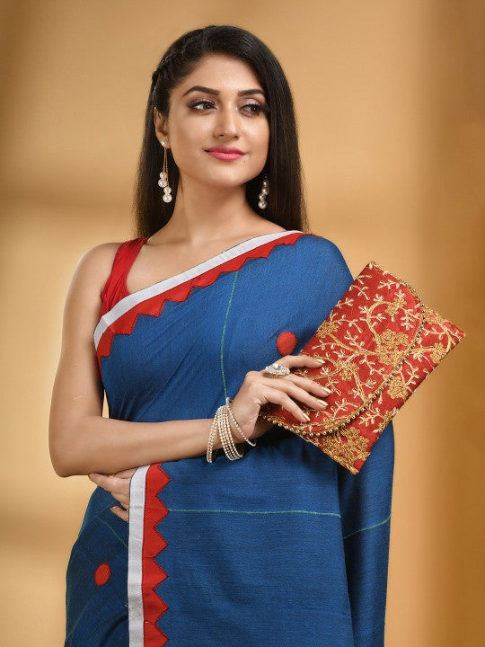 Blue and red taant saree. Striped saree with embroidered border. Has embroidered detail. The saree comes with an unstitched blouse piece. The blouse worn by the model might be for modelling purpose only. Check the image of the blouse piece to understand how the actual blouse piece looks like.