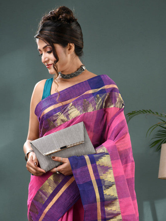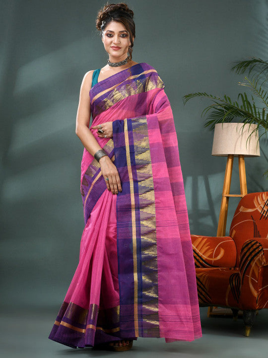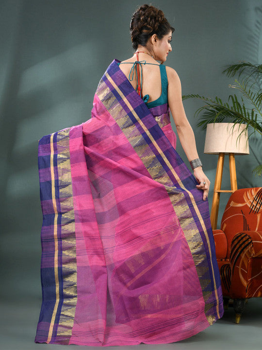 Description This elegant DESH BIDESH Taant Saree showcases a beautiful blend of pink and purple hues. Crafted from pure cotton, it ensures comfort and breathability for extended wear. The saree features a sophisticated striped pattern throughout, adding a touch of contemporary flair to traditional design. Its distinct striped border is intricately detailed with zari work, enhancing the overall aesthetic appeal. This traditional Indian drape is perfect for festive occasions, daily wear, or casual gatherings. The lightweight fabric allows for easy draping and comfortable movement. It comes with an unstitched blouse piece, offering versatility for custom tailoring. Pair it with ethnic jewellery and heels for a complete, graceful look. A timeless addition to any ethnic wear collection, this saree blends tradition with modern style effortlessly.