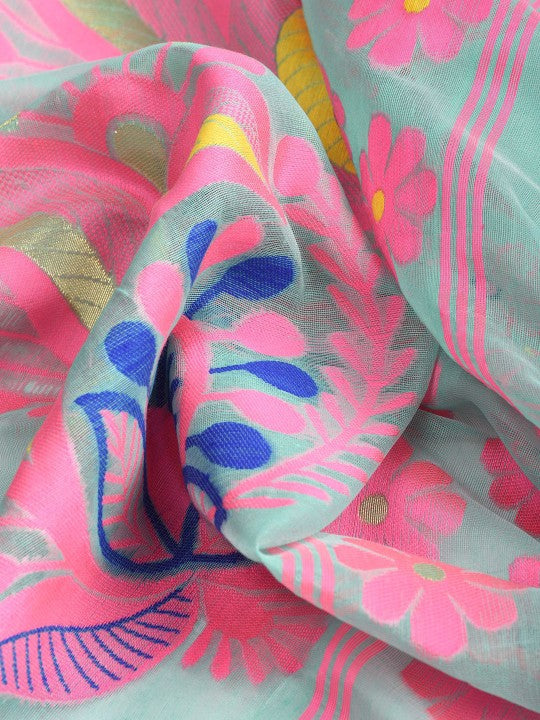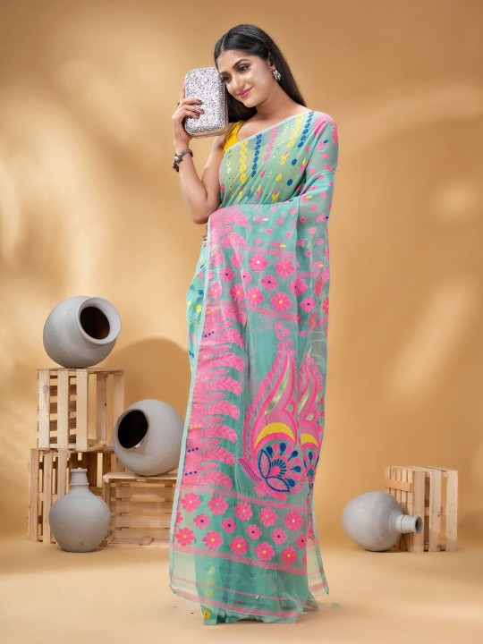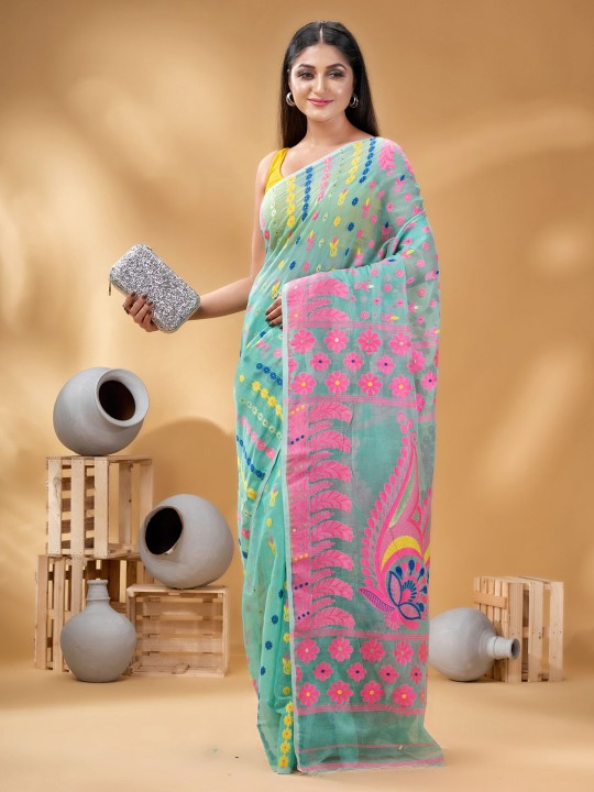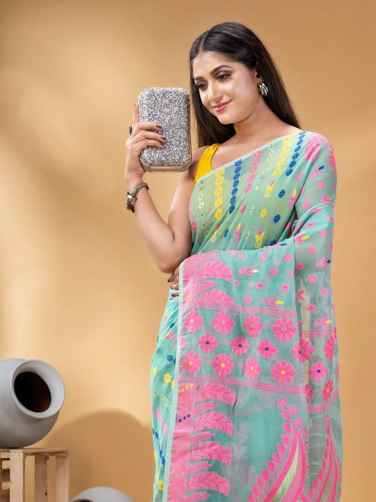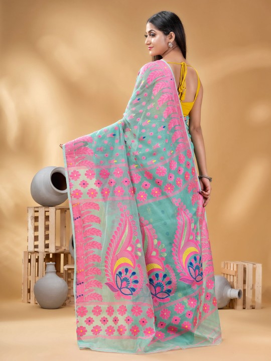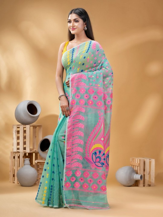 Description This exquisite DESH BIDESH Jamdani Saree, crafted from pure cotton, features intricate ethnic motifs and a woven design border. The saree showcases a vibrant turquoise blue and pink color combination, making it a striking addition to any ethnic wear collection. It is designed to offer both elegance and comfort, ideal for various occasions. The Jamdani weaving technique lends a unique texture and traditional appeal to the fabric. This saree is perfect for those seeking a blend of cultural heritage and contemporary style. The lightweight pure cotton ensures breathable wear throughout the day. Dry clean care is recommended to maintain its pristine condition and vibrant colours. The saree does not include a blouse piece.