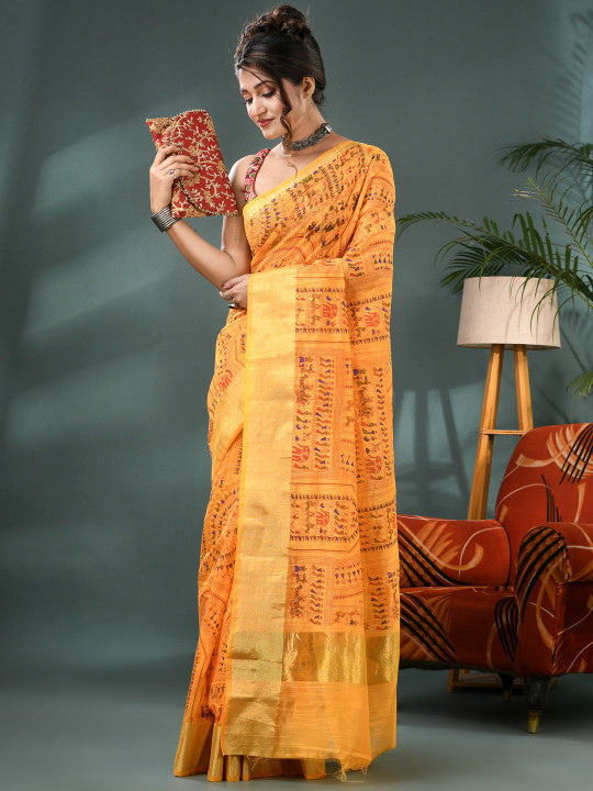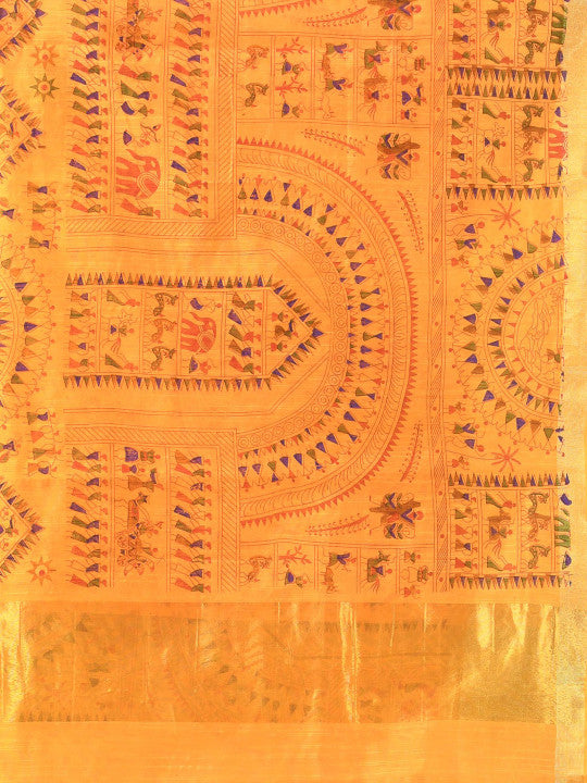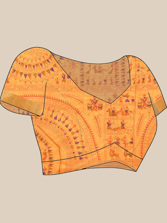Design Details Yellow and yellow bandhani saree. Warli printed saree with zari border. The saree comes with an unstitched blouse piece. The blouse worn by the model might be for modelling purpose only. Check the image of the blouse piece to understand how the actual blouse piece looks like.