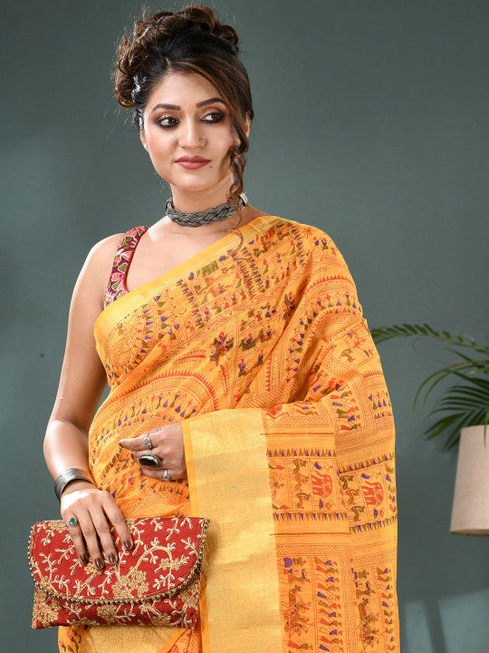 Yellow and yellow bandhani saree. Warli printed saree with zari border. The saree comes with an unstitched blouse piece. The blouse worn by the model might be for modelling purpose only. Check the image of the blouse piece to understand how the actual blouse piece looks like.