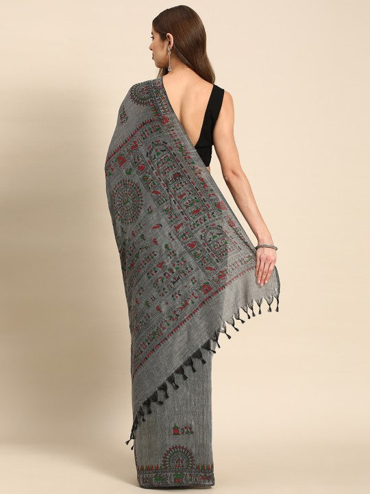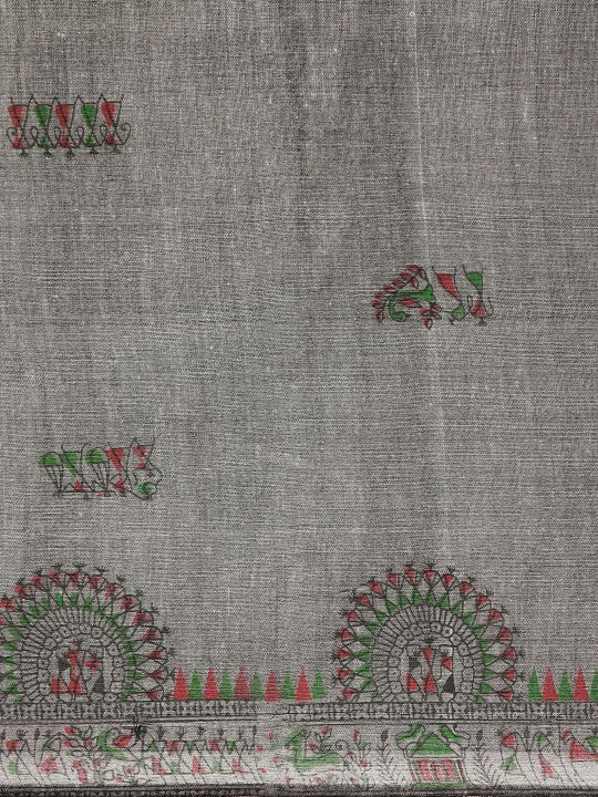 This elegant DESH BIDESH Warli Pure Cotton Taant Saree showcases a beautiful grey hue, perfect for various occasions. It features an intricate Warli print throughout, adding a touch of traditional artistry to its design. The saree is adorned with a complementary printed border, enhancing its aesthetic appeal. Crafted from pure cotton, this saree ensures comfort and breathability for extended wear. It comes complete with an unstitched blouse piece, allowing for custom tailoring to your preference. The saree measures 6.3 metres (approximately 248.03 inches) in length, including the blouse piece. Its width is approximately 1.06 metres (around 41.73 inches), providing ample drape. This easy-to-maintain garment requires dry cleaning for optimal care. Embrace timeless Indian fashion with this exquisite Warli Taant Saree.