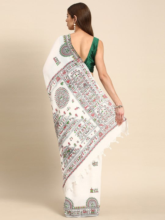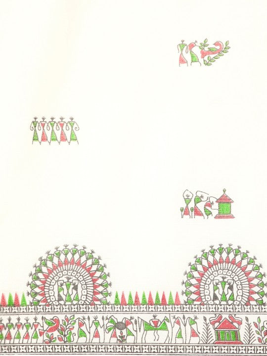 This DESH BIDESH Warli Pure Cotton Taant Saree is a beautiful white taant saree. It features an elegant Warli print along with a distinctive printed border. The saree comes with an unstitched blouse piece, allowing for custom fitting. Please note that the blouse worn by the model is for styling purposes only; refer to the blouse piece image for its actual appearance. Crafted from pure cotton, this saree ensures comfort and breathability. It is recommended to dry clean this garment for maintenance. The blend of traditional Warli art with a modern design makes it a versatile ethnic wear option. Its soft fabric drapes gracefully, enhancing your silhouette. This saree is perfect for various festive and casual occasions. Add a touch of cultural elegance to your wardrobe with this exquisite piece.