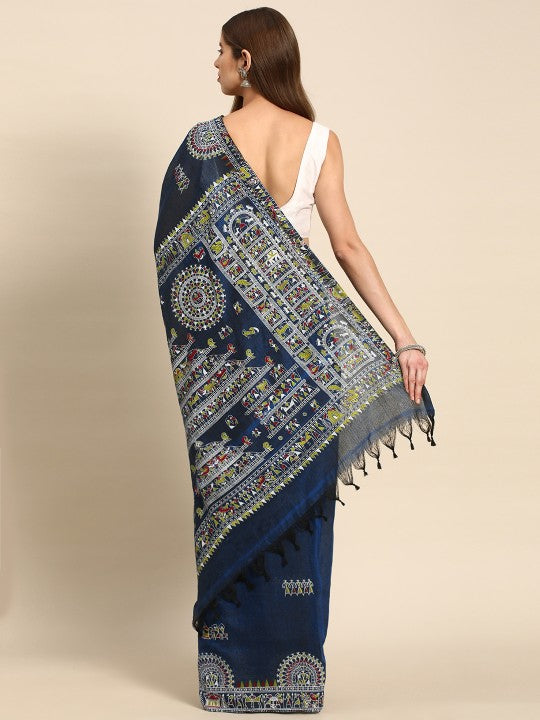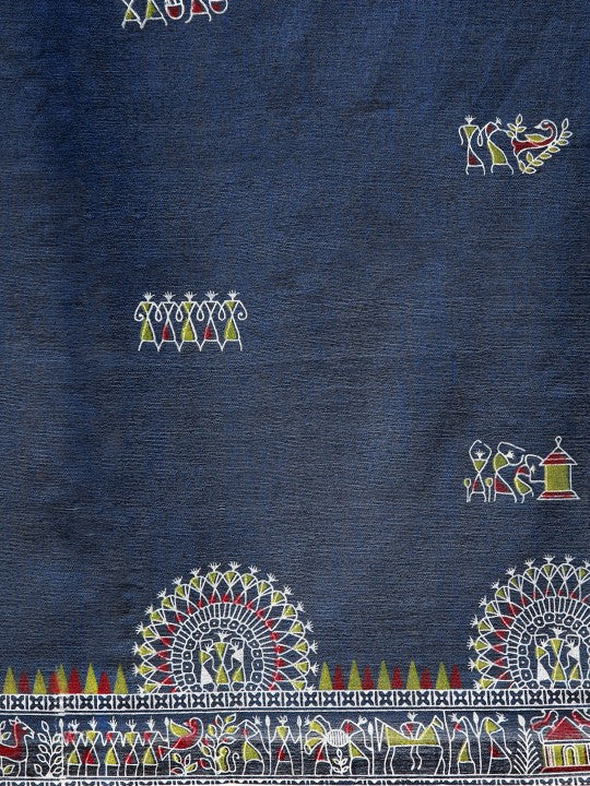 Blue taant saree. Warli printed saree with printed border. The saree comes with an unstitched blouse piece. The blouse worn by the model might be for modelling purpose only. Check the image of the blouse piece to understand how the actual blouse piece looks like.