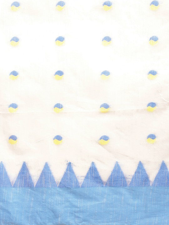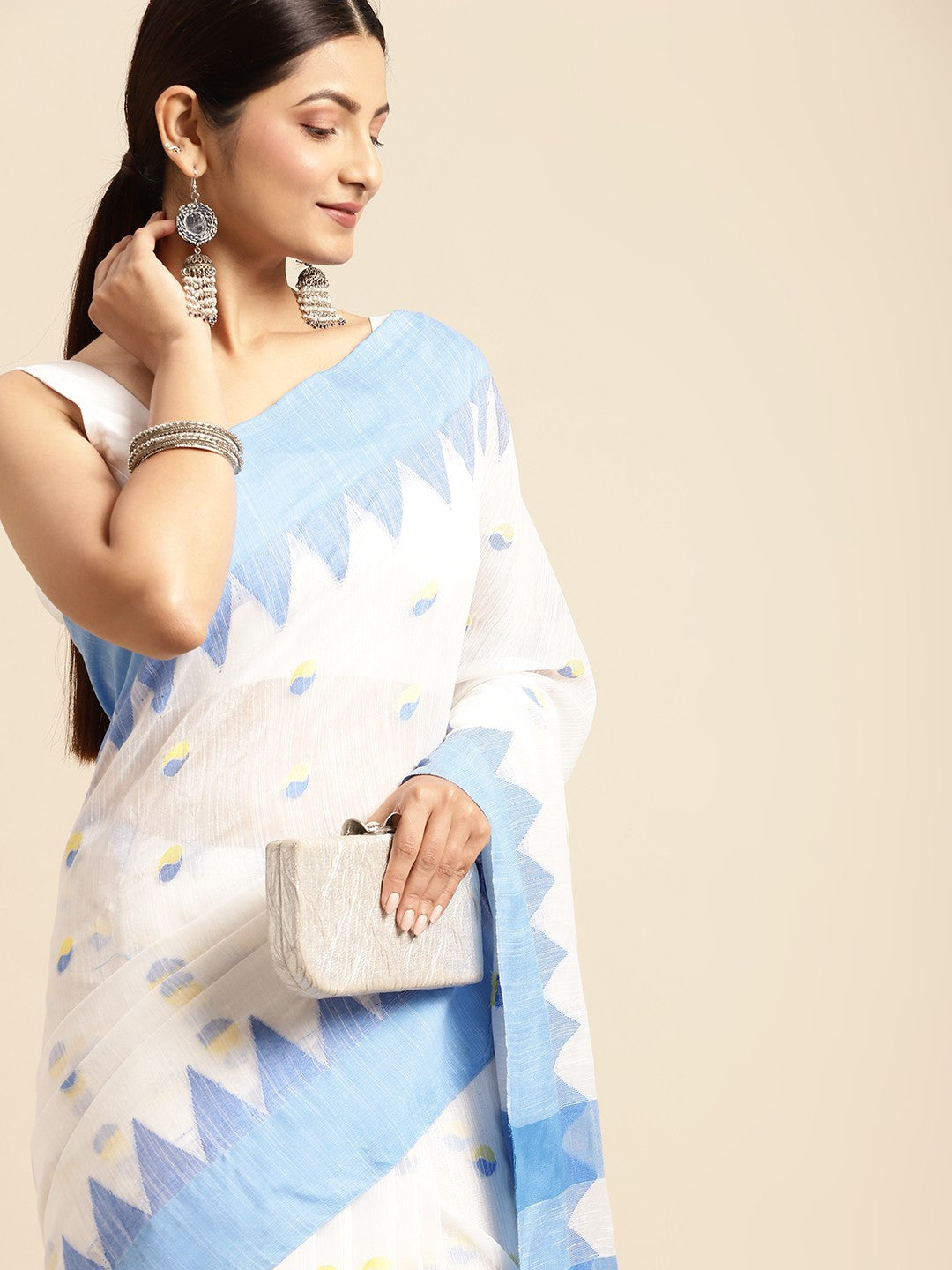White and blue taant saree. Geometric woven design saree with solid border. Disclaimer: The saree comes with an unstitched blouse piece. The blouse worn by the model might be for modelling purpose only. Check the image of the blouse piece to understand how the actual blouse piece looks like.