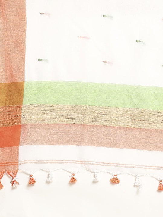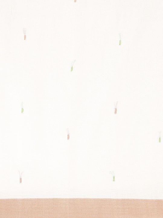 This elegant white and orange Taant saree from DESH BIDESH showcases a beautiful geometric woven design, perfectly complemented by a sophisticated solid border. Crafted from pure cotton, this saree offers exceptional comfort and a graceful drape, ideal for various occasions. It comes with an unstitched blouse piece, allowing for a customized fit to your preference. Please note that the blouse worn by the model is purely for styling demonstration. We recommend checking the image of the actual blouse piece to understand its true appearance. This exquisite piece reflects traditional craftsmanship blended with contemporary aesthetics. Its lightweight nature ensures ease of wear throughout the day. Elevate your ethnic wardrobe with this timeless and versatile saree. It is designed to provide both style and comfort. This saree is a perfect addition for those seeking traditional charm with a modern touch.
