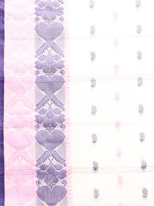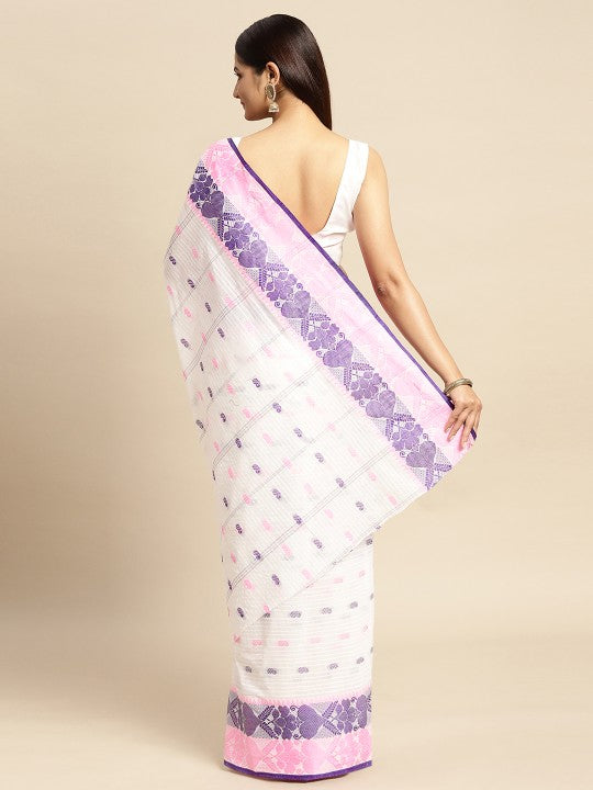 This exquisite DESH BIDESH White & Pink Ethnic Motifs Pure Cotton Taant Saree is a splendid choice for women seeking traditional elegance. Crafted from pure cotton, this saree offers unparalleled comfort and breathability, ideal for various occasions. It features intricate ethnic motifs with a beautifully woven design border, adding a touch of classic charm. The combination of white and pink hues creates a soft yet vibrant aesthetic, perfect for both daytime events and evening gatherings. This taant saree showcases traditional weaving techniques, reflecting rich cultural heritage and artisanal skill. Please note that this saree does not include a blouse piece; the model's blouse is for styling purposes only. Its generous length of approximately 6.01 yards and width of about 41.73 inches ensure a graceful drape for most body types. The lightweight fabric makes it easy to wear and carry, providing comfort throughout the day. This piece embodies timeless beauty, making it a valuable addition to any ethnic wardrobe. For best care, dry cleaning is recommended to maintain the fabric's quality and intricate design.