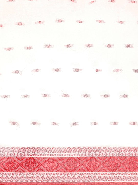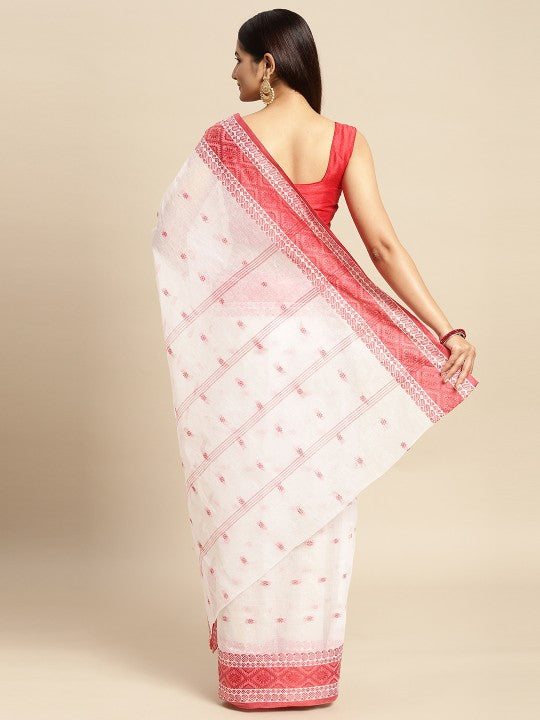 White & Red Ethnic Motifs Pure Cotton Taant Saree