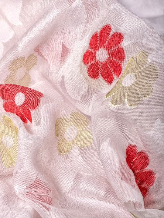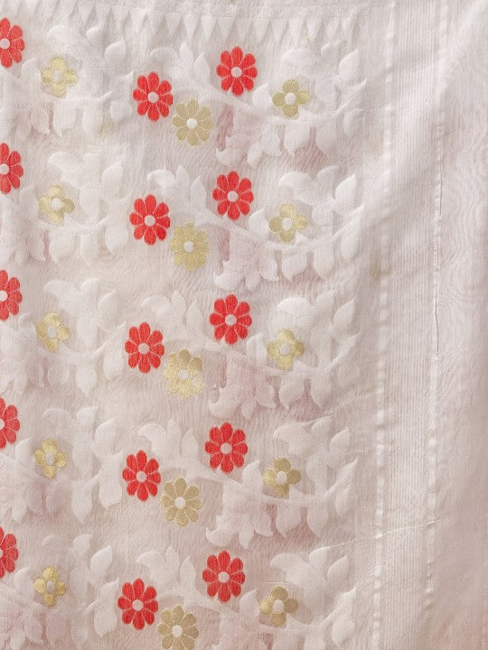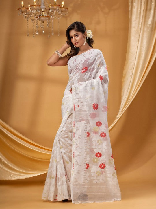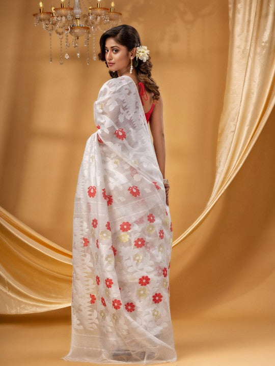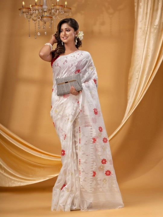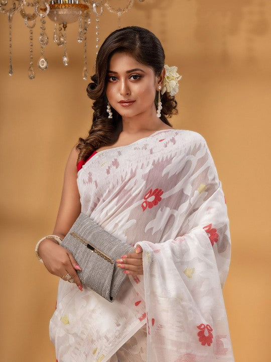 White & Red Pure Cotton Jamdani Saree, Woven Zari Design