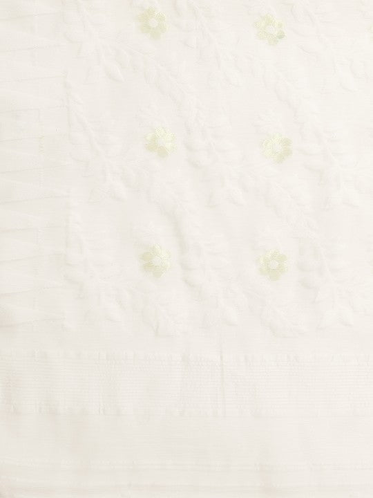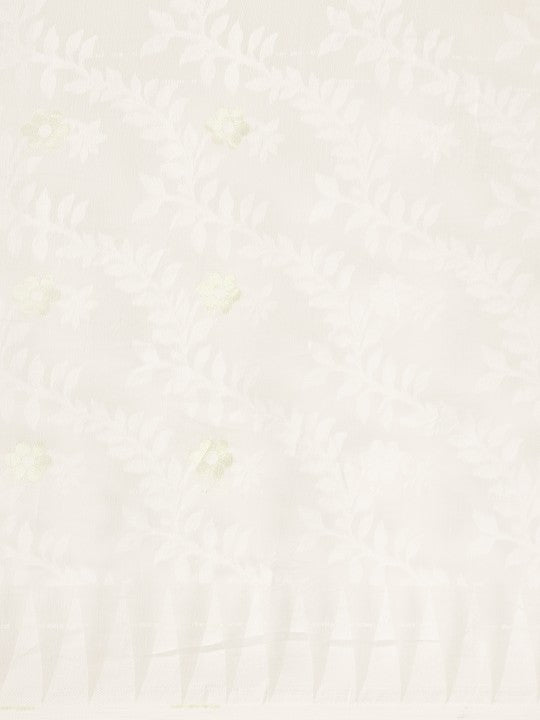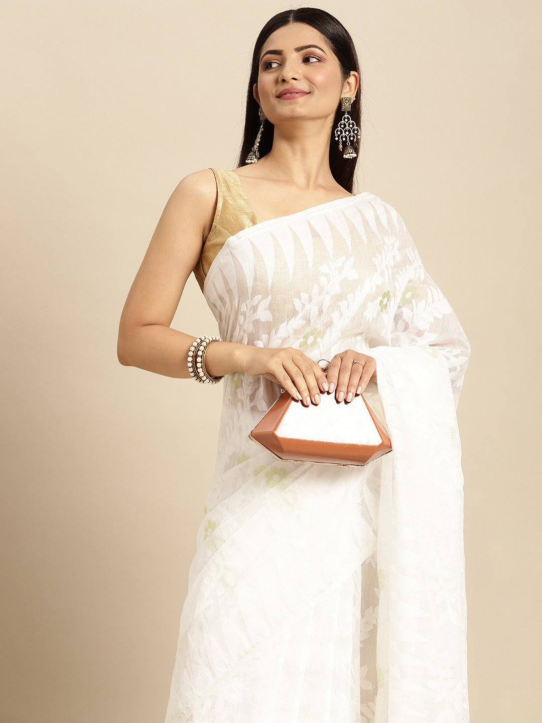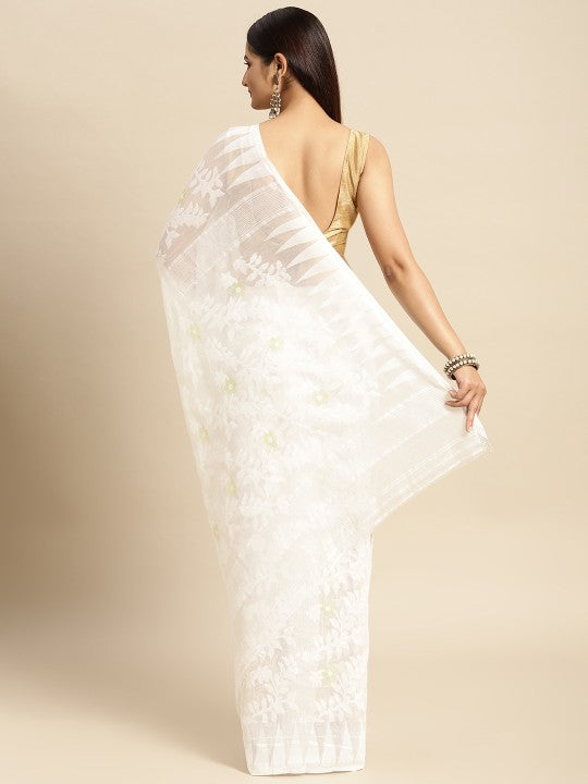 This elegant DESH BIDESH White Woven Design Pure Cotton Jamdani Saree offers timeless grace and traditional charm. Crafted from pure cotton, it ensures exceptional comfort and breathability, making it ideal for extended wear. The intricate Jamdani weaving technique highlights traditional Indian artistry, adding a sophisticated texture and unique pattern to the fabric. Its serene white hue provides versatility, suitable for a range of occasions from festive celebrations to formal gatherings. The saree features a beautiful woven design throughout, enhancing its overall aesthetic appeal. This lightweight fabric drapes effortlessly, creating a graceful and flattering silhouette for every wearer. Please note, this saree does not come with a separate blouse piece, allowing for a personalized choice of blouse to complement your style. Designed for longevity, it requires dry cleaning to maintain its pristine condition and delicate weave. Embrace the rich cultural heritage and exquisite craftsmanship with this comfortable and elegant Jamdani saree.