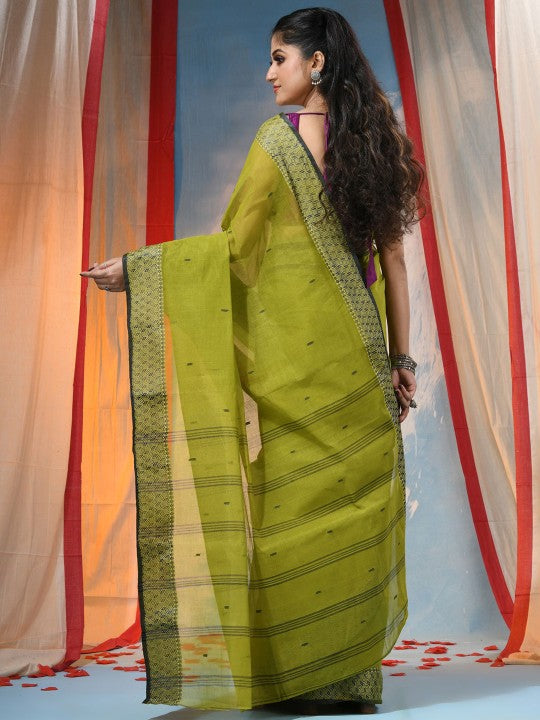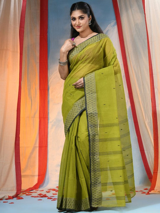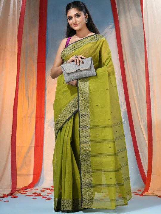 Green and grey saree, ethnic motifs woven design saree with woven design border. Length: 5.5 metres plus 0.8 metre blouse piece, width: 1.06 metres (approx.). Dry clean only.