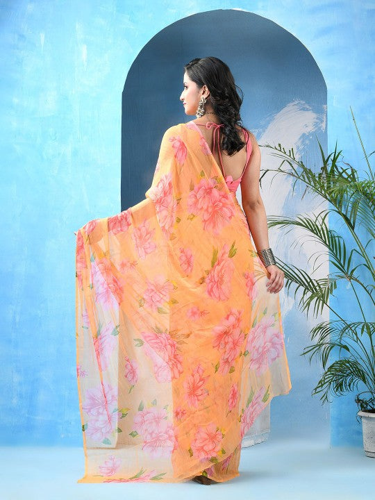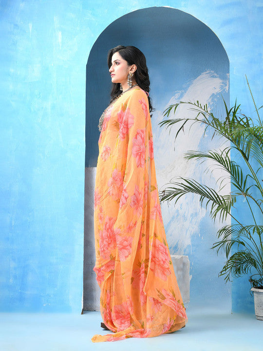 This exquisite DESH BIDESH saree showcases a vibrant blend of orange and pink hues. It features an intricate floral print, adding a touch of elegance and charm. The traditional bandhani pattern further enhances its aesthetic appeal. Designed without a border, this saree offers a contemporary and sleek look. It comes complete with an unstitched blouse piece, allowing for a custom fit. Please note that the blouse displayed on the model is solely for illustrative purposes. For an accurate representation, kindly refer to the image of the actual blouse piece provided. Crafted from lightweight poly chiffon, it ensures comfortable draping throughout the day. This versatile piece is perfect for festive occasions, weddings, or cultural gatherings. Elevate your traditional wardrobe with this stunning and graceful saree.
