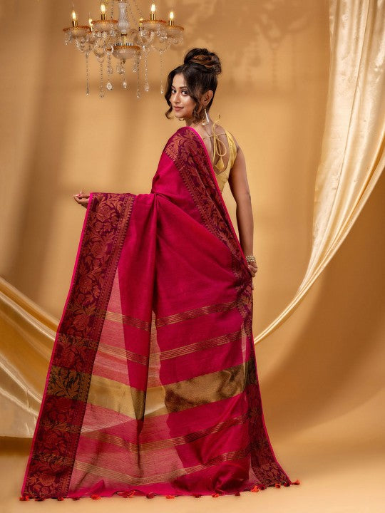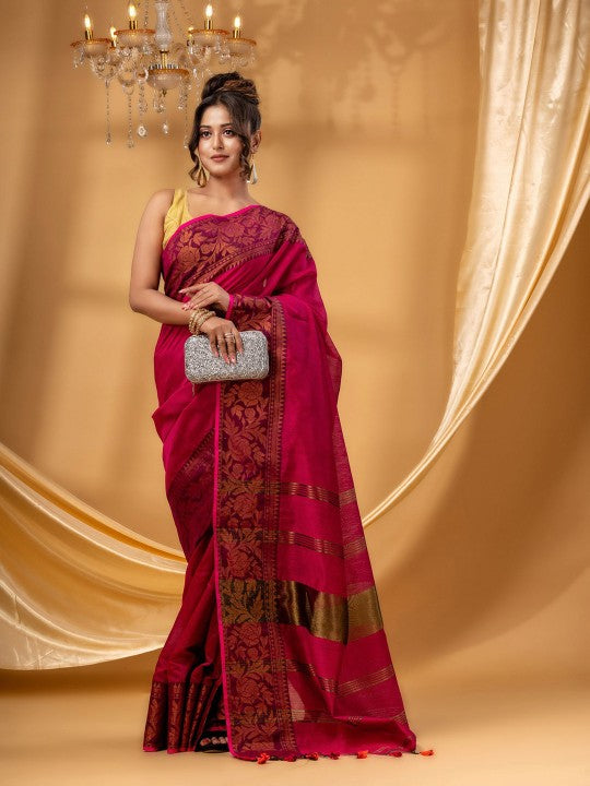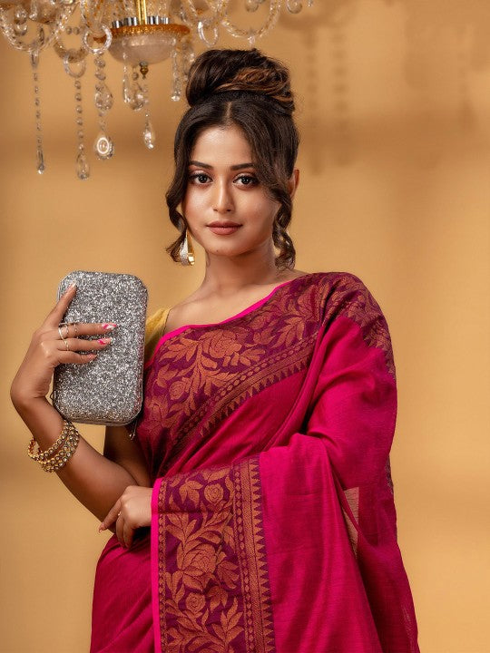 Pink chanderi saree. Floral woven design saree with woven design border. Has zari detail. The saree comes with an unstitched blouse piece. The blouse worn by the model might be for modelling purpose only. Check the image of the blouse piece to understand how the actual blouse piece looks like.
