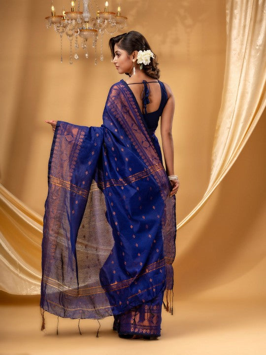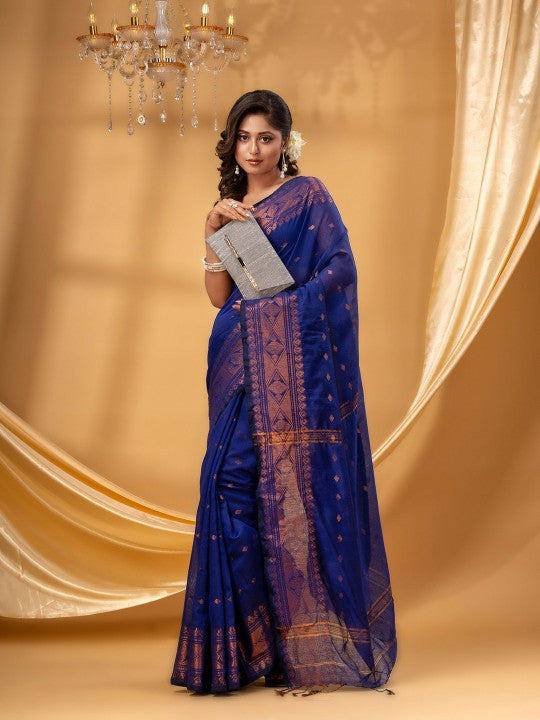 Blue and copper-toned taant saree. Woven design saree with woven design border. Has zari detail. The saree comes with an unstitched blouse piece. The blouse worn by the model might be for modeling purpose only. Check the image of the blouse piece to understand how the actual blouse piece looks like.