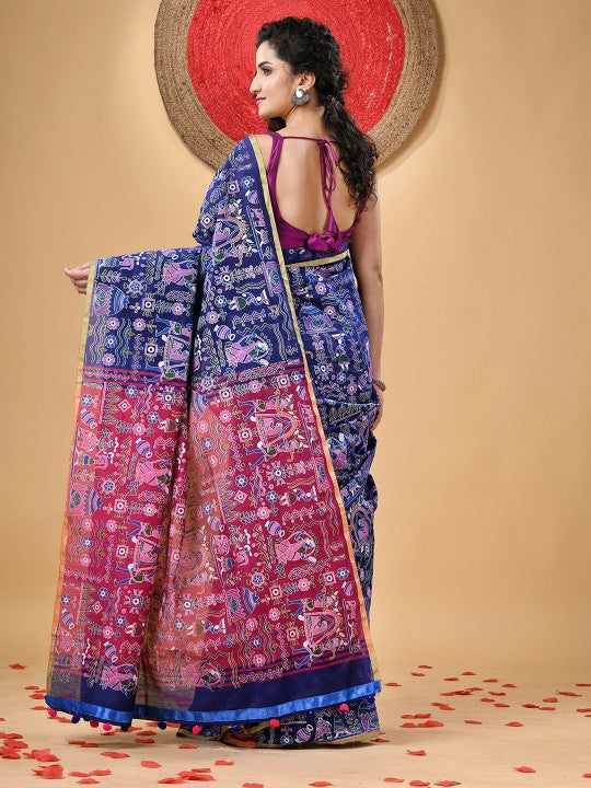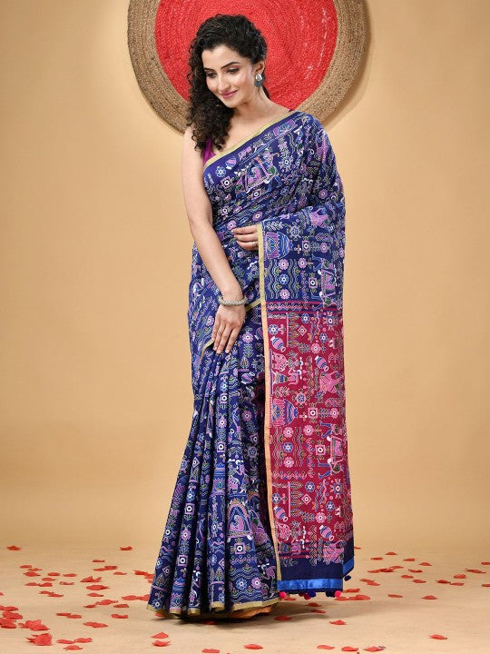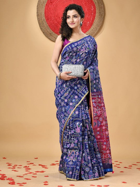 This exquisite saree features traditional ethnic motifs and intricate zari work, perfect for cultural celebrations. Crafted from a comfortable cotton blend, it offers both elegance and ease of wear. The saree includes an unstitched blouse piece, allowing for personalized tailoring. Its vibrant blue and pink hues create a striking visual appeal. This garment is designed for dry-clean only to maintain its delicate embellishments. The detailed zari border enhances its classic aesthetic. This piece is a testament to traditional Indian craftsmanship, suitable for various occasions. The fabric drapes beautifully, ensuring a flattering silhouette. It embodies a blend of rich heritage and contemporary style. This saree is an essential addition to any discerning wardrobe.