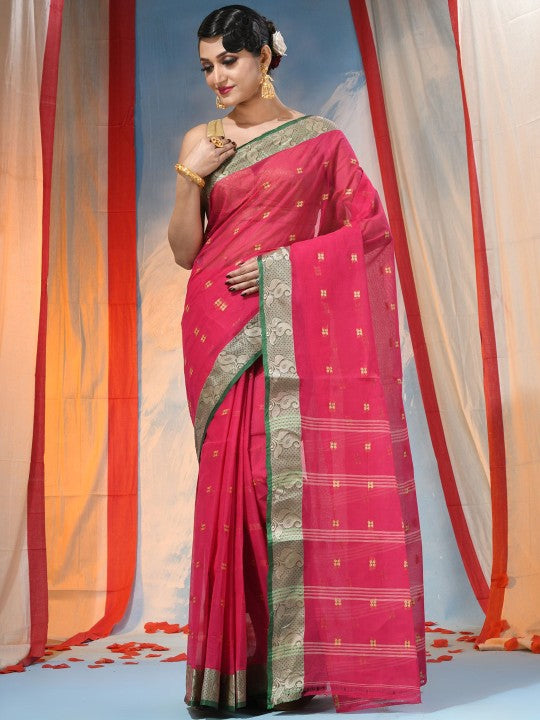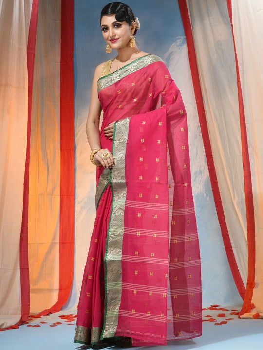 Unleash your inner diva with this stunning pure cotton saree! Adorned with captivating ethnic motifs and a charming woven design border, it's perfect for any festive occasion. This delightful saree comes with a matching blouse piece, making it a complete ensemble for effortless elegance. Crafted for comfort and style, this piece will have you twirling with joy. Get ready to turn heads and spread smiles wherever you go!