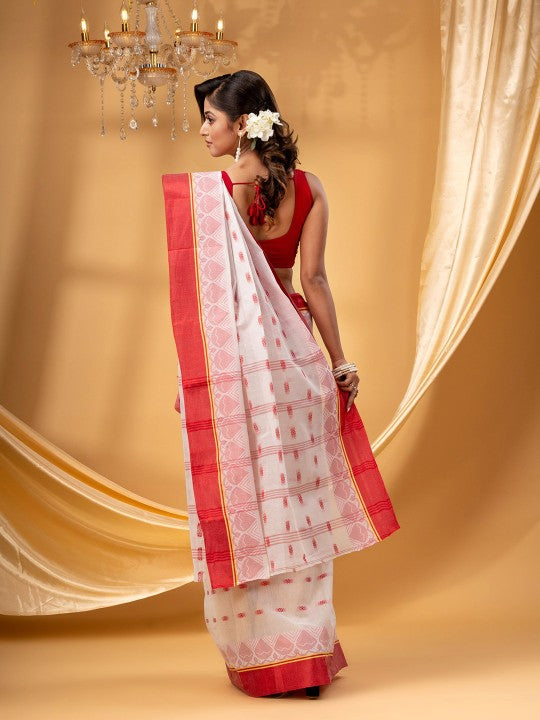 This exquisite DESH BIDESH Taant saree, crafted from pure cotton, exemplifies traditional Indian weaving artistry. Its pristine white body is elegantly contrasted with a striking red woven design border, enhancing its visual appeal. Intricate zari work adorns the border, adding a touch of sophisticated shimmer and opulence. The lightweight cotton fabric ensures exceptional comfort and breathability, making it ideal for various occasions. This saree drapes beautifully, offering a graceful silhouette suitable for festive gatherings or daily wear. The meticulous weaving technique showcases the rich heritage of Taant craftsmanship. It comes complete with a matching blouse piece, allowing for a cohesive and customisable ensemble. This versatile piece combines timeless elegance with contemporary design elements. A dry clean only care instruction ensures the longevity and pristine condition of the delicate fabric and zari. Invest in this authentic piece to elevate your ethnic wardrobe with traditional charm and refined quality.