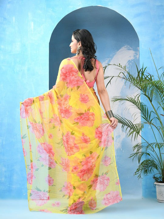 Description Elevate your ethnic wear collection with this exquisite DESH BIDESH Women's Floral Printed Bandhani Saree. This stunning saree features a vibrant yellow and pink bandhani design, adorned with delicate floral prints throughout. Crafted from premium poly chiffon fabric, it offers a lightweight and graceful drape, perfect for various occasions. The saree comes complete with an unstitched blouse piece, allowing for custom tailoring to your preference. Its intricate bandhani work reflects traditional Indian craftsmanship, adding a touch of cultural elegance to your ensemble. The absence of a prominent border ensures a contemporary and versatile look. This saree is designed for comfort and style, making it ideal for festive celebrations or casual gatherings. Pair it with your favourite accessories to create a truly captivating appearance. For maintenance, a dry clean is recommended to preserve its vibrant colours and delicate fabric. Embrace timeless beauty and modern design with this beautiful bandhani saree.