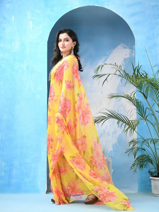 Elevate your ethnic wear collection with this exquisite DESH BIDESH Women's Floral Printed Bandhani Saree. This stunning saree features a vibrant yellow and pink bandhani design, adorned with delicate floral prints throughout. Crafted from premium poly chiffon fabric, it offers a lightweight and graceful drape, perfect for various occasions. The saree comes complete with an unstitched blouse piece, allowing for custom tailoring to your preference. Its intricate bandhani work reflects traditional Indian craftsmanship, adding a touch of cultural elegance to your ensemble. The absence of a prominent border ensures a contemporary and versatile look. This saree is designed for comfort and style, making it ideal for festive celebrations or casual gatherings. Pair it with your favourite accessories to create a truly captivating appearance. For maintenance, a dry clean is recommended to preserve its vibrant colours and delicate fabric. Embrace timeless beauty and modern design with this beautiful bandhani saree.